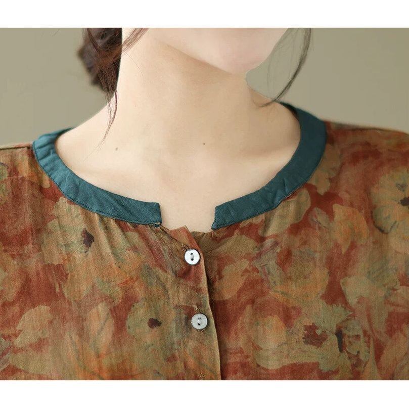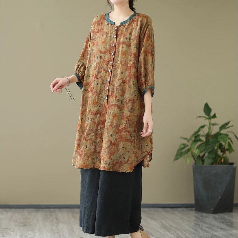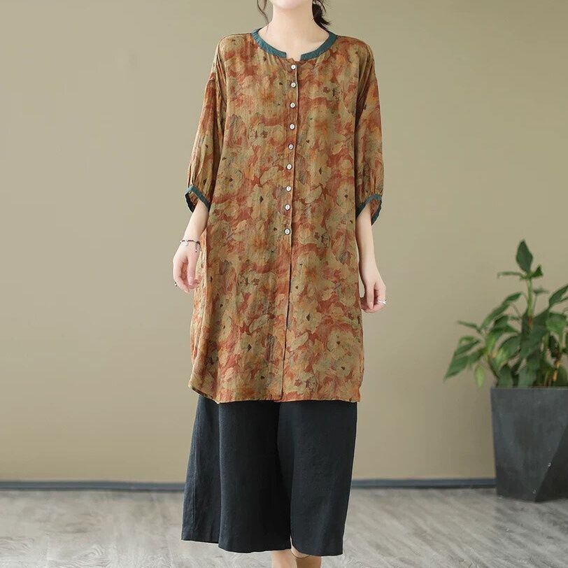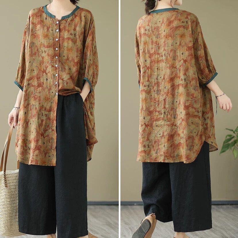 花柄のシフォン素材でできた、スタンドカラー・7分袖・チュニック丈のシャツブラウスです。ランタンのような袖にゆったりとしたシルエットがエレガントな、リラックスした雰囲気のアイテムです。柄は2種類から選べます。