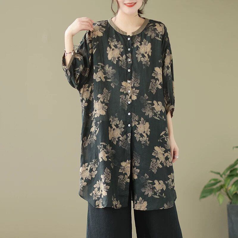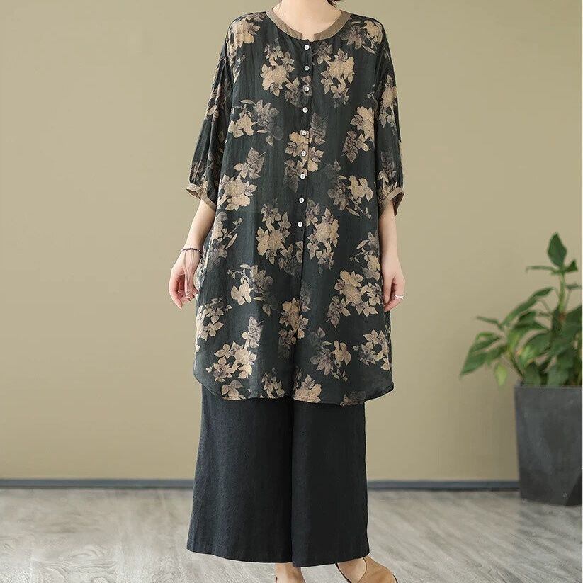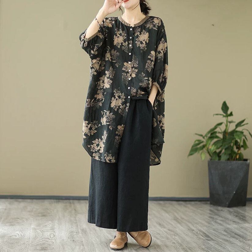 FLOWER PRINT 3/4 LANTERN SLEEVES TUNIC SHIRT 2colors M-16491