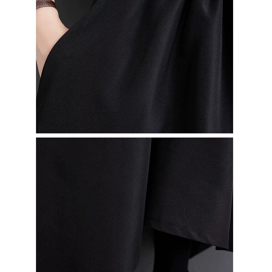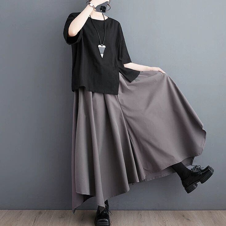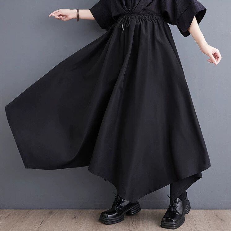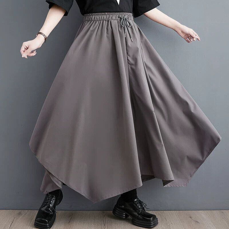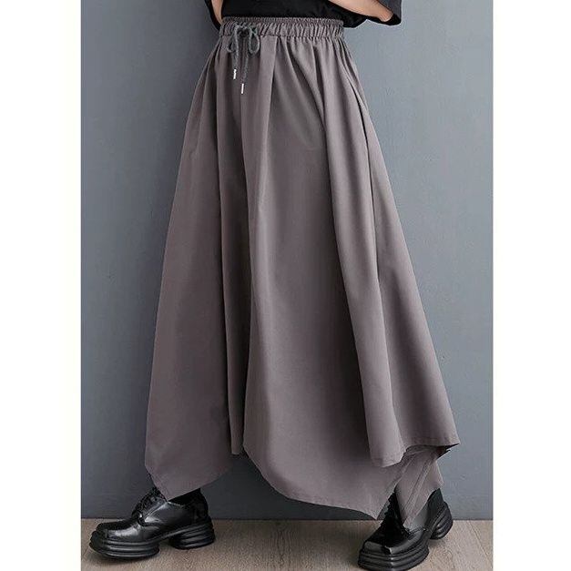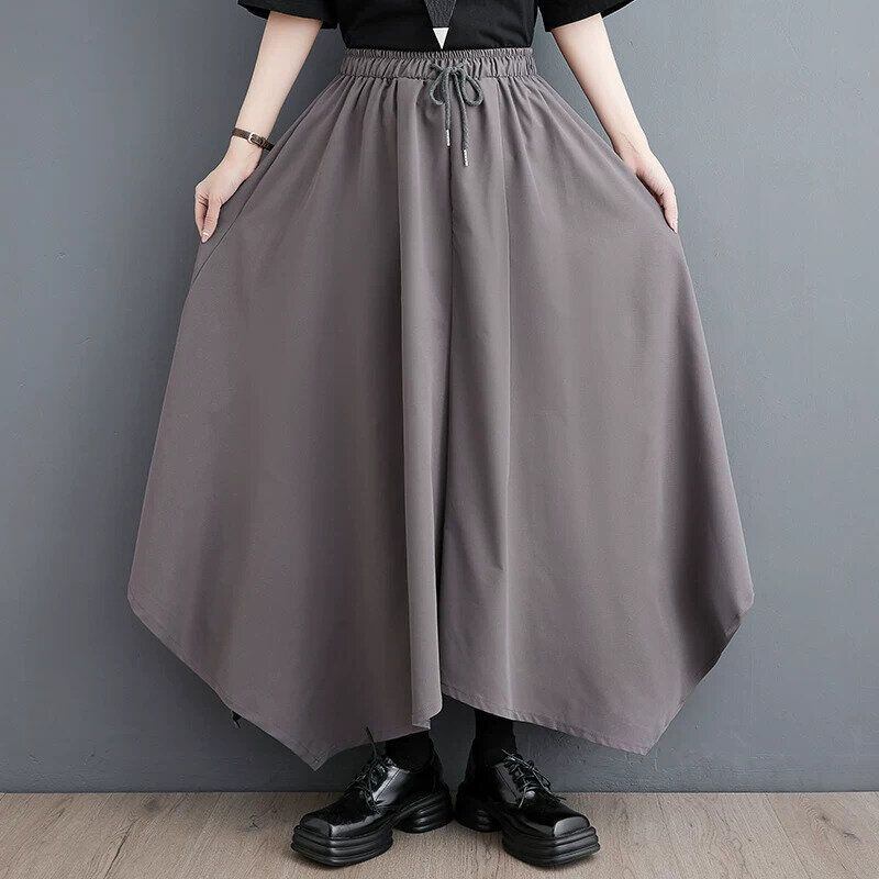 単色の滑らかな素材でできた、Aラインのワイドレッグ・クロップドパンツです。ウエストはゴム+ドローストリングで、履き心地がいいです。スカートのようなシルエットにイレギュラーな裾のラインが魅力的な、コーディネートしやすいアイテムです。色はブラックとグレーの2色から選べます。