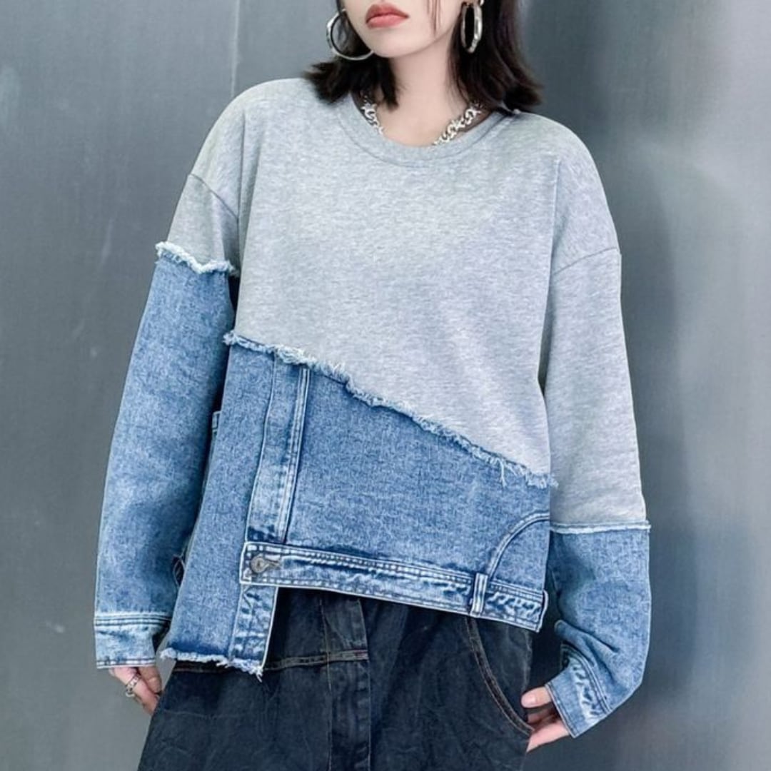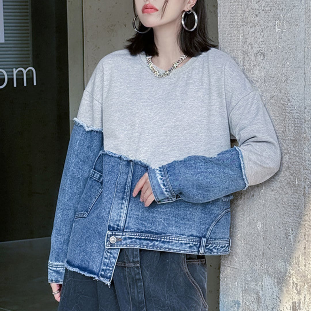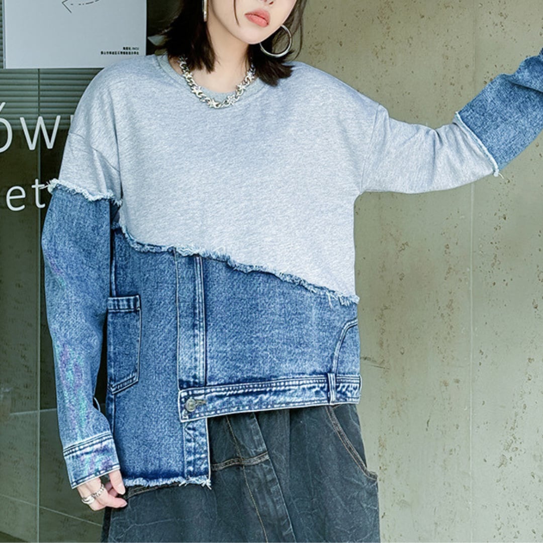 ASYMMETRIC DENIM CONTRAST LONG SLEEVE TOPS 2colors M-191