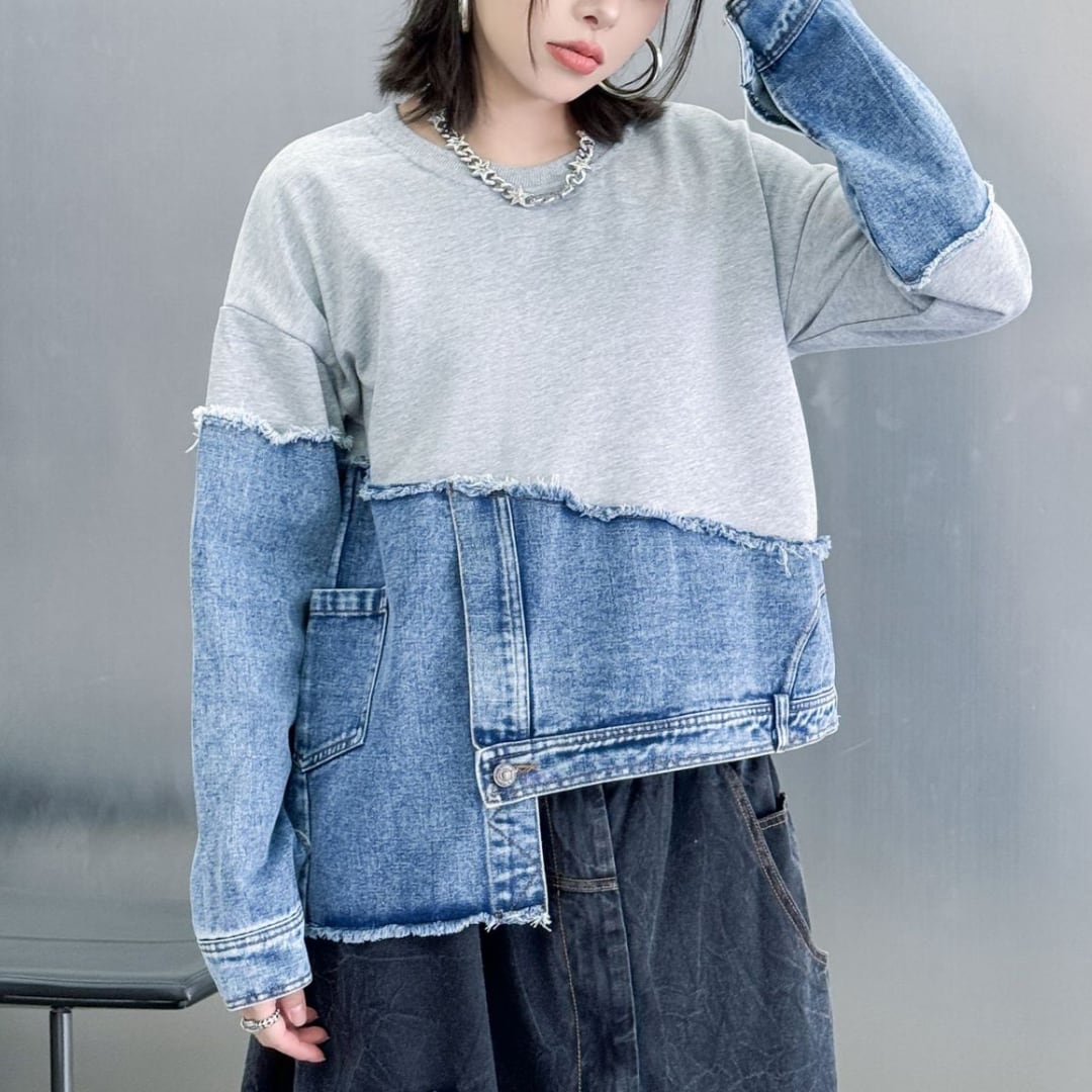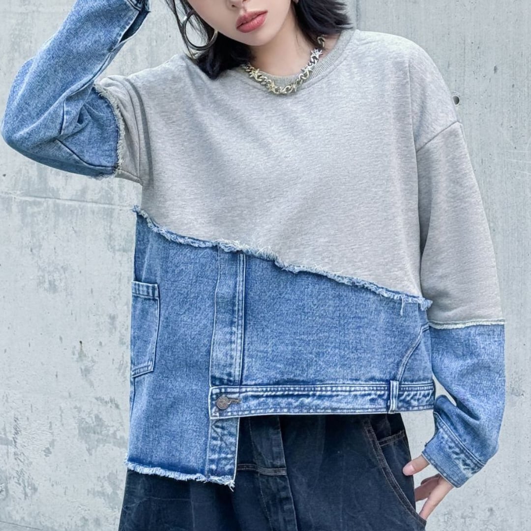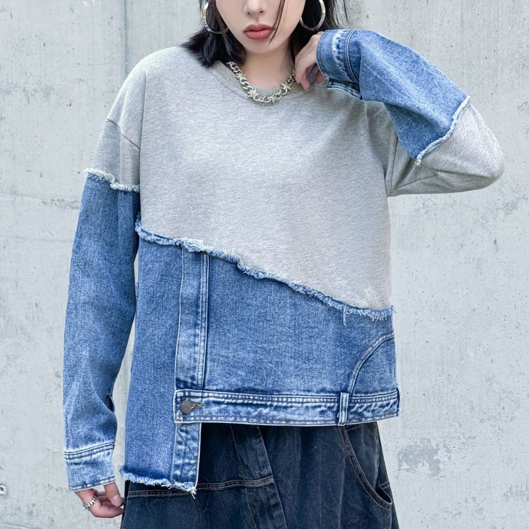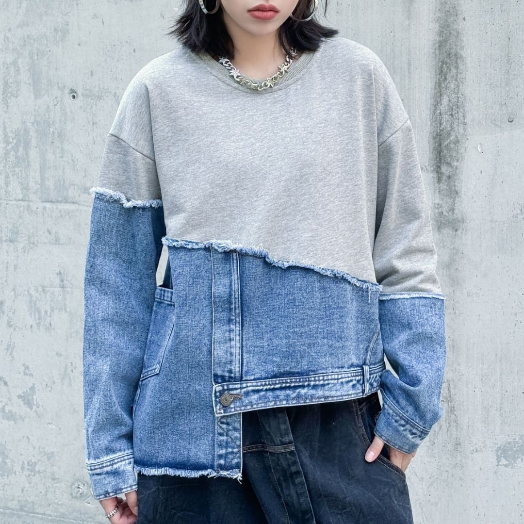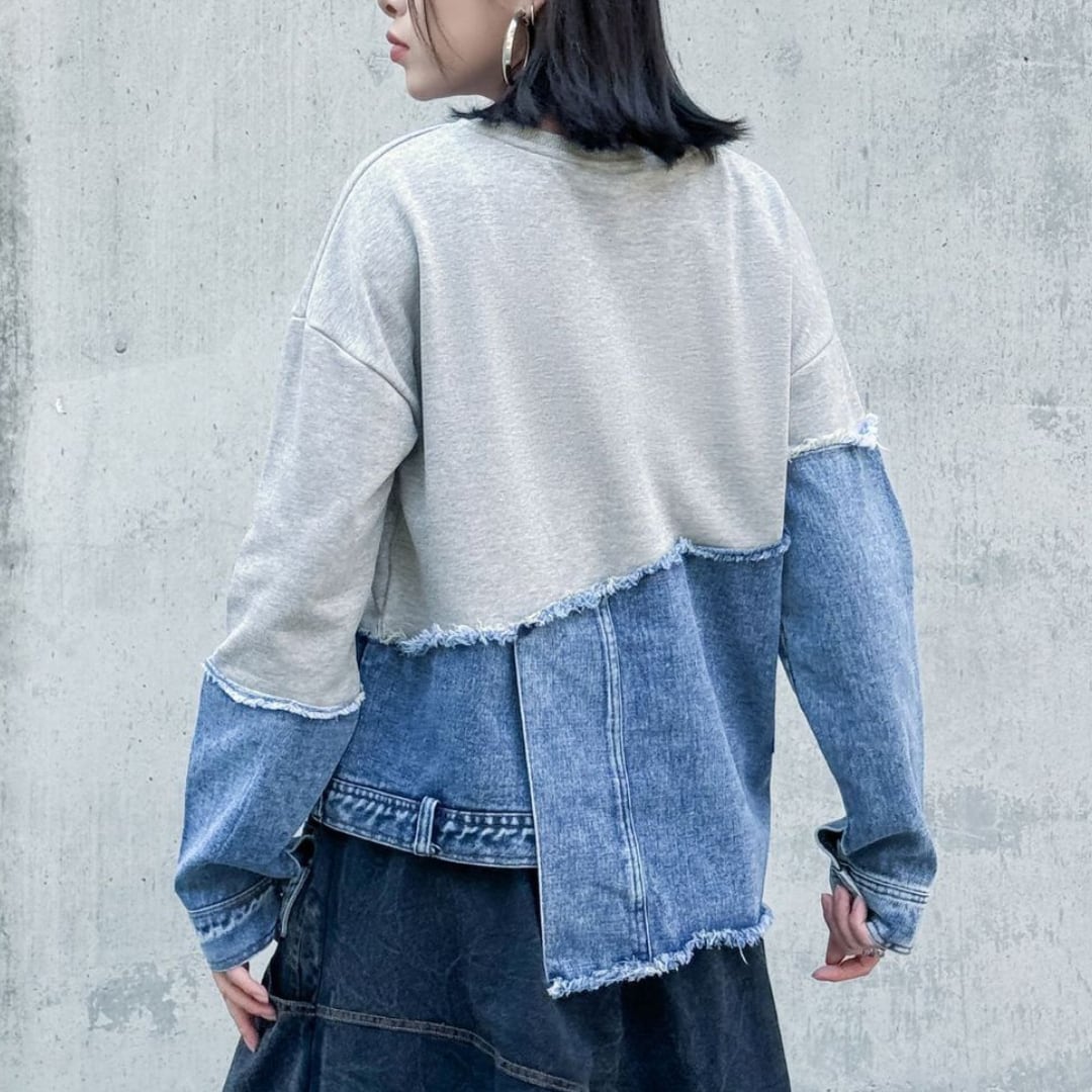 スウェットとデニム素材をドッキングさせたデザイントップス。