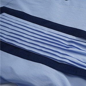 シンプルな水色のシャツワンピースにパイピングが施され、胸下辺りから下はそのまま紐を垂れ下げたデザインのアイテムです。胸元のパイピングテープの間はプリーツ加工が施されています。