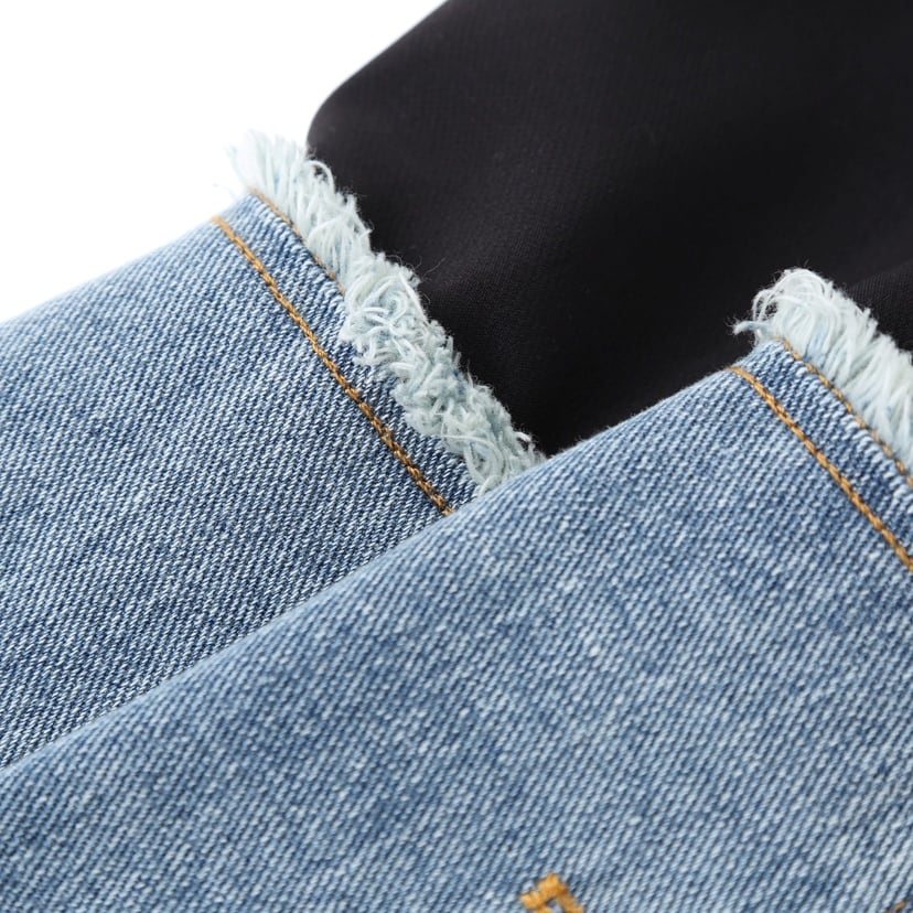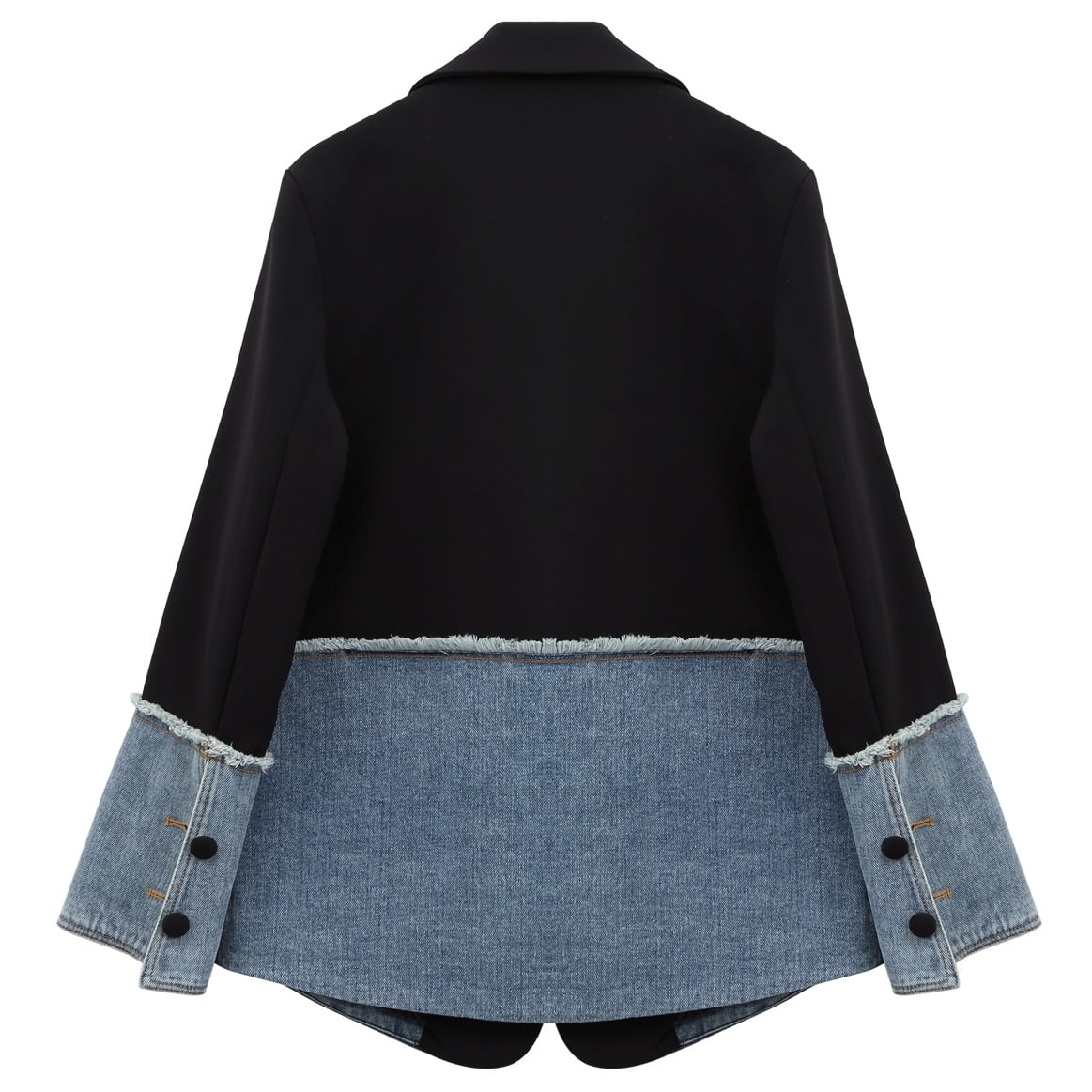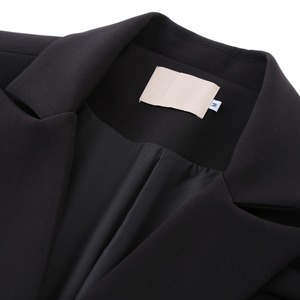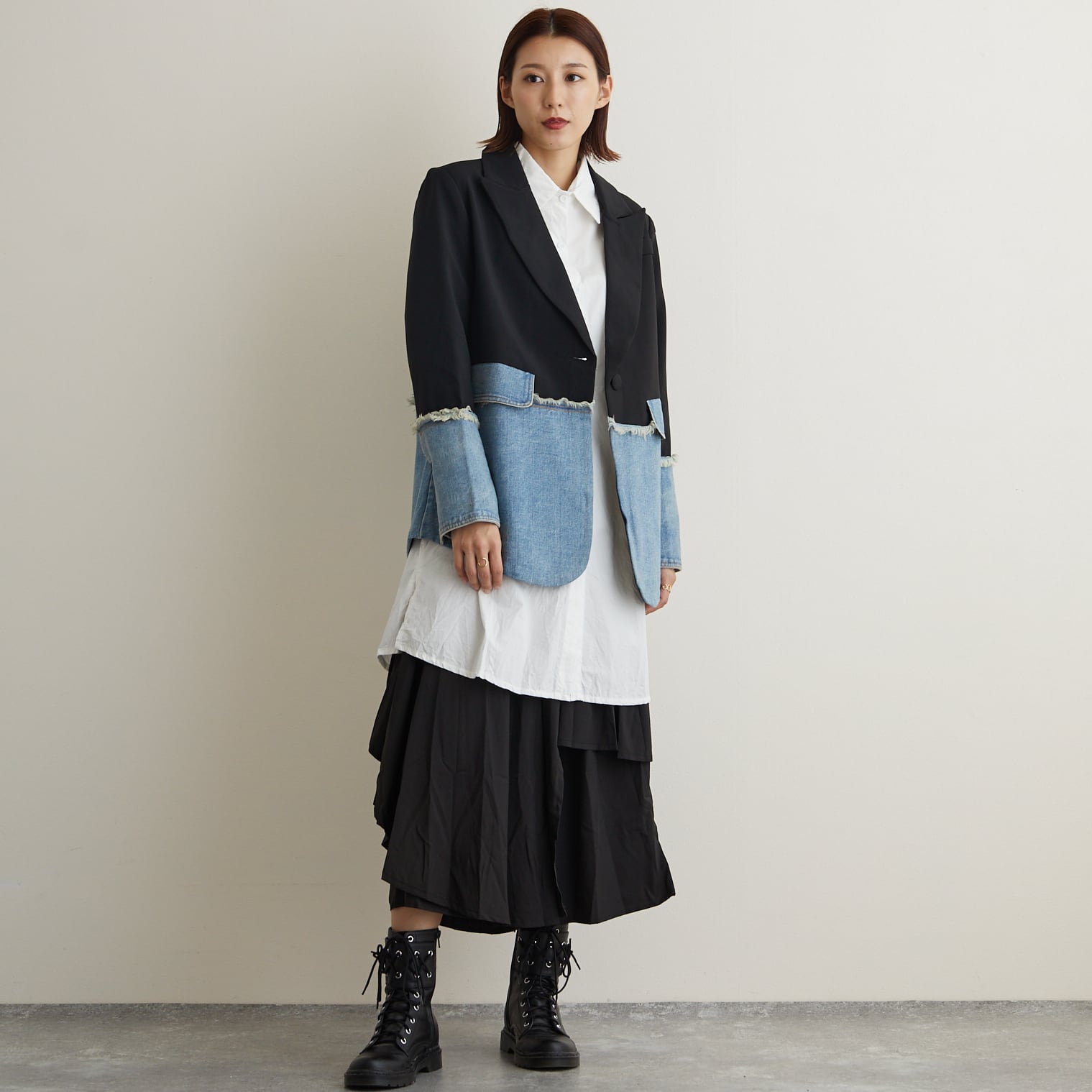 袖とボディの下半分をデニム生地にした、コントラストカラーが目を惹く、ブラックのブレザージャケットです。ピークドラペルの襟は優雅で華やかな印象を与えます。固い印象をデニム生地で柔らかくカジュアルな印象に仕上げました。丸みのあるカッティングや包みボタンがガーリーさをプラスしています。スカートにもパンツスタイルにもよく合うハンサムなアイテムです。