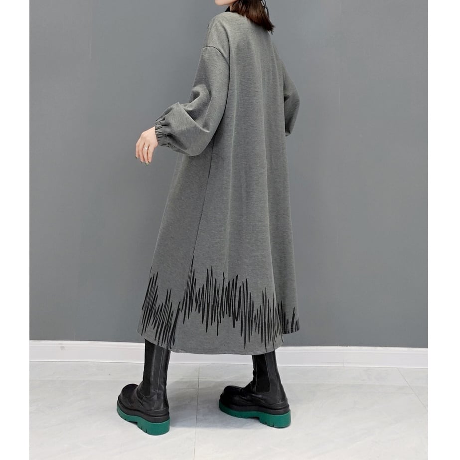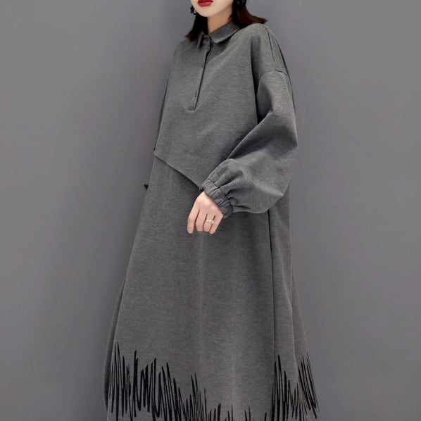 グレーの厚手の生地でできた、ポロ襟・ハーフボタン・長袖・ロング丈のデザインワンピースです。袖口や裾の右サイドがゴムで加工されていたり、フロントの上半身がレイヤードデザインになっていたりと、細部までこだわりを感じるデザインです。