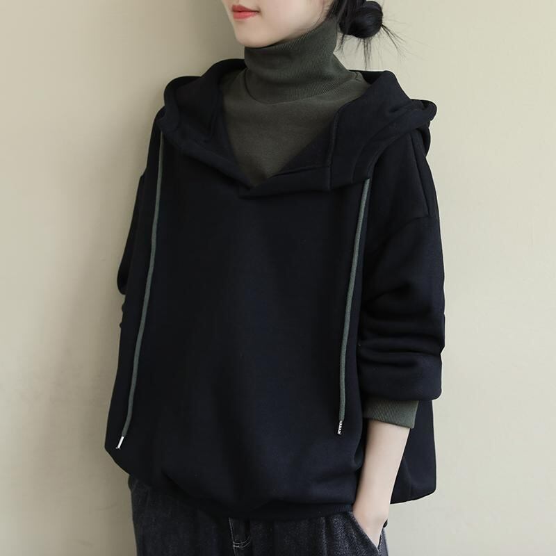 パーカーの中にタートルネックのニットを着ているような、フェイクツーピースデザインのプルオーバートップです。色はアーミーグリーンとブラックの2色から選べます。1枚でコーディネートが完成するオシャレなカジュアルアイテムです。