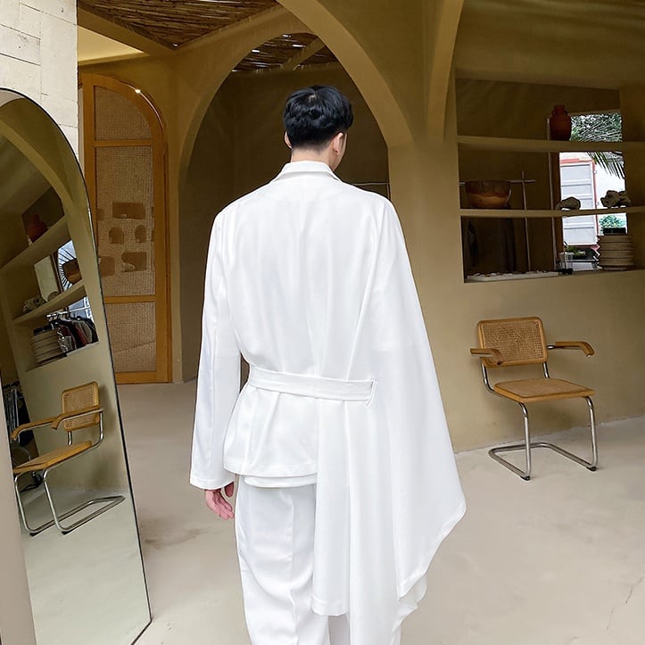 半身がローブのようなシルエットになった、ダブルブレストのブレザー型ジャケットです。柔らかく滑らかな単色生地でできています。色はブラックとホワイトの2色から選べます。 SIZE:※測り方によって2-3cmの差が生じる場合がございます。 【M】バスト118cm 肩幅46cm 袖丈64cm 着丈98cm 【L】バスト128cm 肩幅47cm 袖丈65cm 着丈99cm 【XL】バスト128cm 肩幅48cm 袖丈66cm 着丈100cm COLOR:White、Black 素材:ポリエステル、綿、その他 モデル着用サイズ:L モデル情報:身長180cm 体重65kg お届けについて こちらの商品は海外店舗より直接発送となる為、 ご決済から到着までは、多くの場合【10日-2週間前後】でお届けしております。 ※在庫状況や輸送の混雑により、4週間前後かかる場合がございます。 注意事項 ・商品在庫切れにより注文キャンセルとさせていただく恐れもございますので、予めご了承くださいませ。 ・仕入れ工場を変えることがあるため、記載サイズと若干異なる場合がございます。 ・商品の色味は、お手持ちのスマートフォンの画面によって実物と若干異なる場合がございます。 ・イメージ違いやサイズ交換等、お客さまご都合による交換、返品は対応出来かねます。 送料について 全国一律580円。ただし、10,000円以上のお買い物で送料無料となります。詳細は下記をご確認ください。 https://www.magniraff.com/blog/2020/07/07/101900 お支払い方法について ・クレジットカード決済(VISA/Mastercard/JCB/アメリカン・エクスプレス) ・あと払い(Pay ID) ・コンビニ決済/Pay-easy ※前払いのお支払い方法 ・銀行振込 ・キャリア決済(docomo/au/ソフトバンク/Y!mobile) https://www.magniraff.com/blog/2020/07/11/123636 当ショップのインスタグラム 新着商品やお得なクーポン情報をご紹介しておりますので是非フォロー及びいいね!をお願いします。コメントも大歓迎です! https://www.instagram.com/magniraff_official/ 公式LINEお友達募集中 【LINEお友達登録リンク】https://lin.ee/G0z7rP3 公式LINEでは、「お得なクーポン情報」や「新着商品のご紹介」などのキャンペーン情報を配信させて頂いております。 管理番号:S-230
