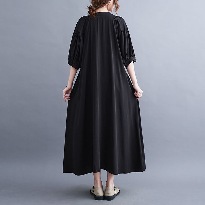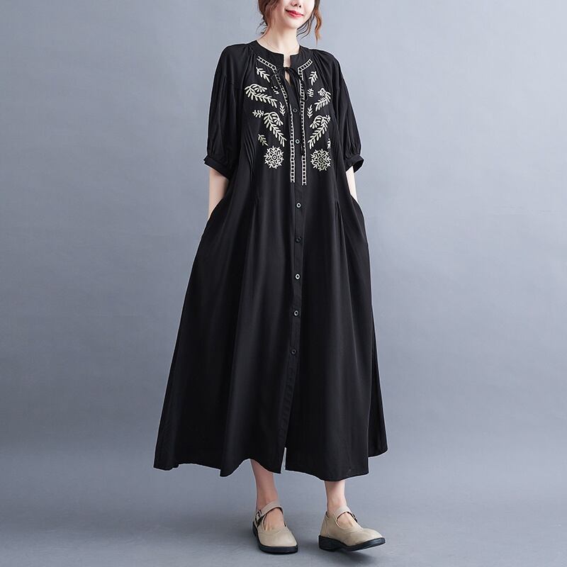 胸元の刺繍飾りが目を惹く、スリットネック・5分袖・ロング丈のシャツワンピースです。バルーンのようなシルエットの袖とゆったりしたAラインのシルエットが、エレガントでリラックスした印象のアイテムです。