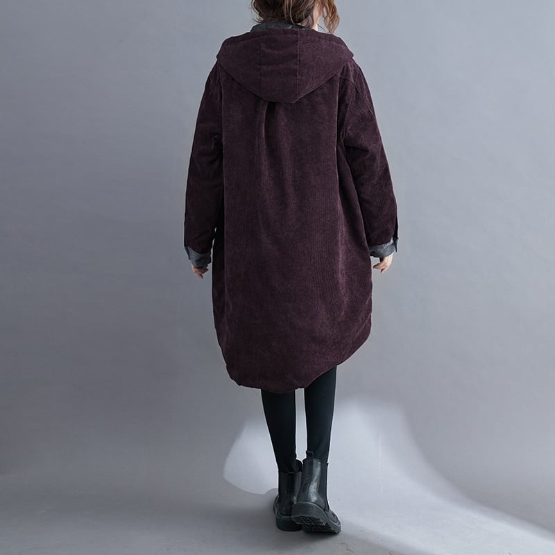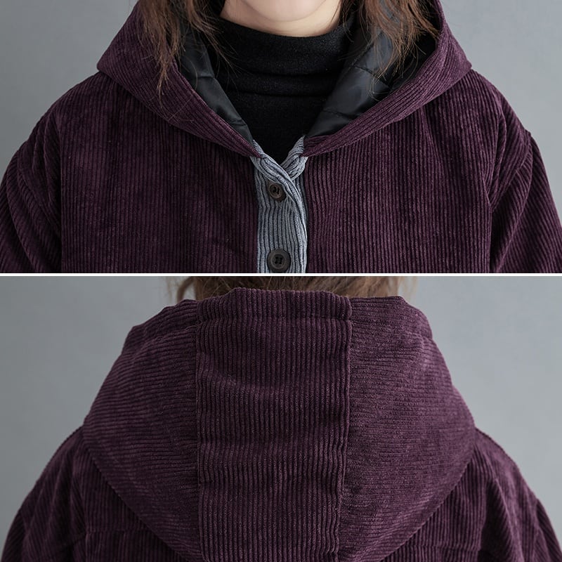 大きなフラップポケットとコントラストのデザインがキュートな、コーデュロイ生地でできたフード付き・ミドル丈のジャケットコートです。中綿パットで温かい、ゆったりとしたシルエットのカジュアルなアイテムです。色はブラウン・パープル・レッドの3色から選べます。