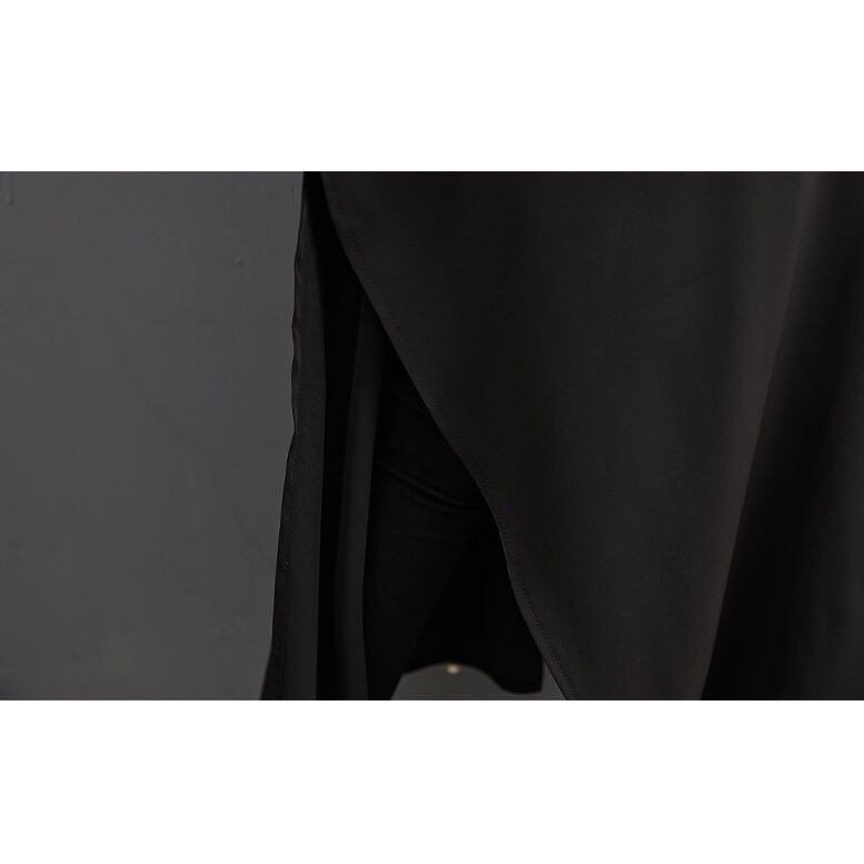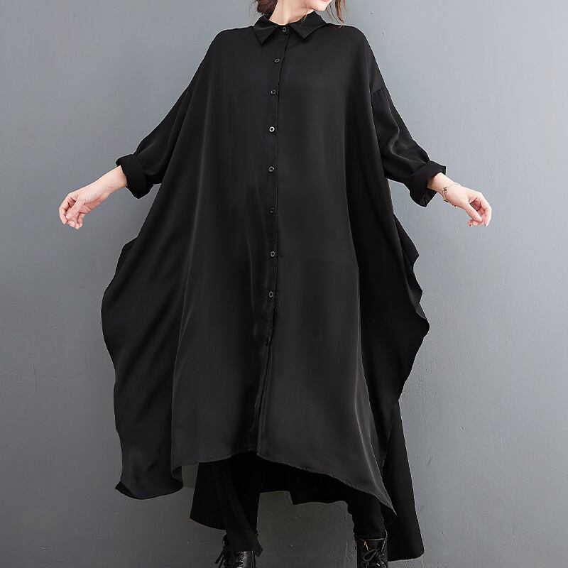 マントのような不規則な裾のラインやバックのレイヤードが特徴的な、ポロ襟・長袖・ロング丈のシャツワンピースです。オールブラックのゆったりとしたシルエットで、小物アレンジが利くオシャレアイテムです。