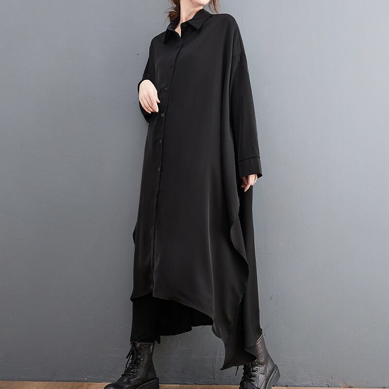 BLACK IRREGULAR HEM LONG SHIRT DRESS 1color M-6217