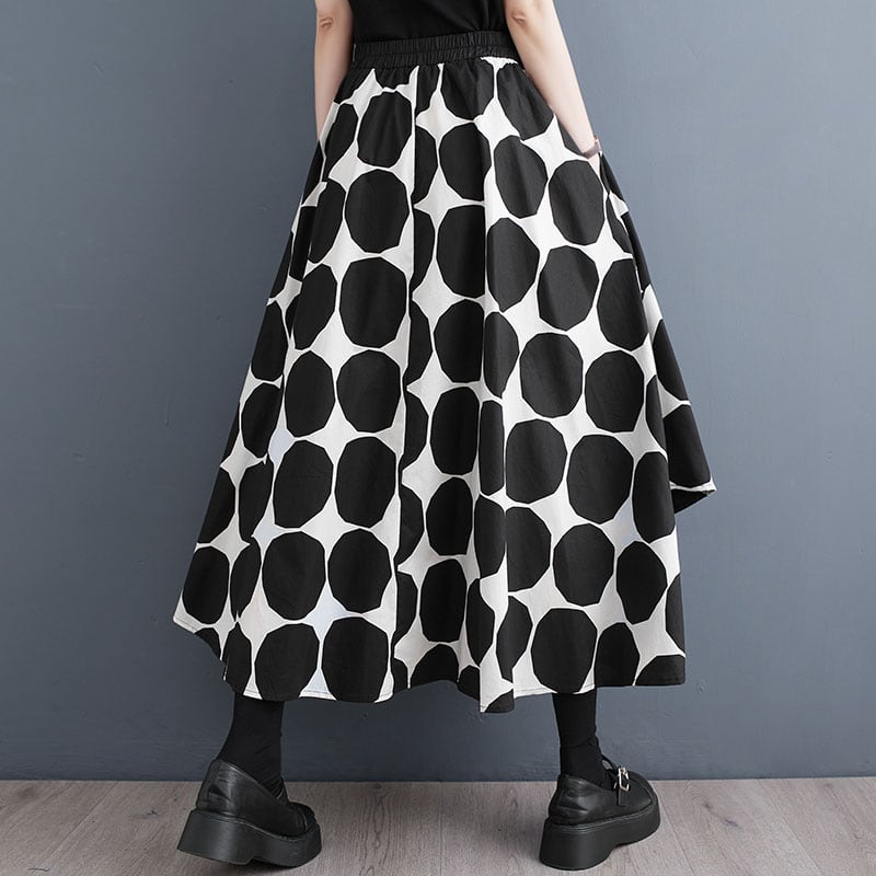 ドット柄とブラックの無地のコントラストがクールな、ウエストがゴムでできた、Aライン・ロング丈のデザインスカートです。ブラックのスティッチの上に重なるフラップがオシャレな、カジュアルアイテムです。