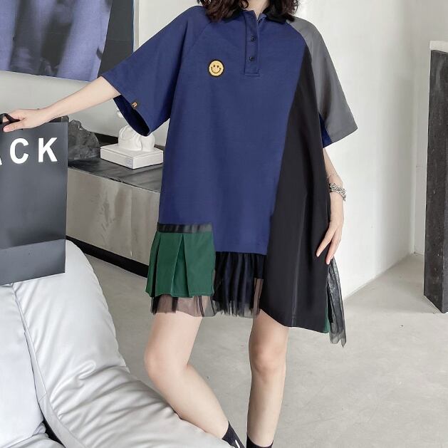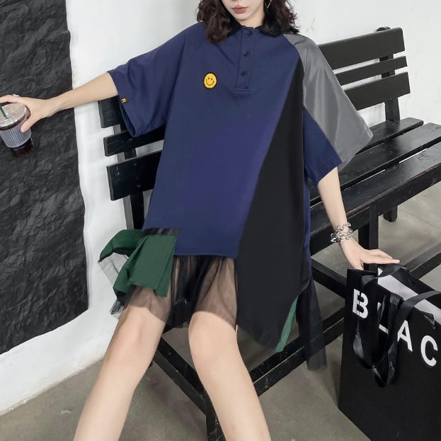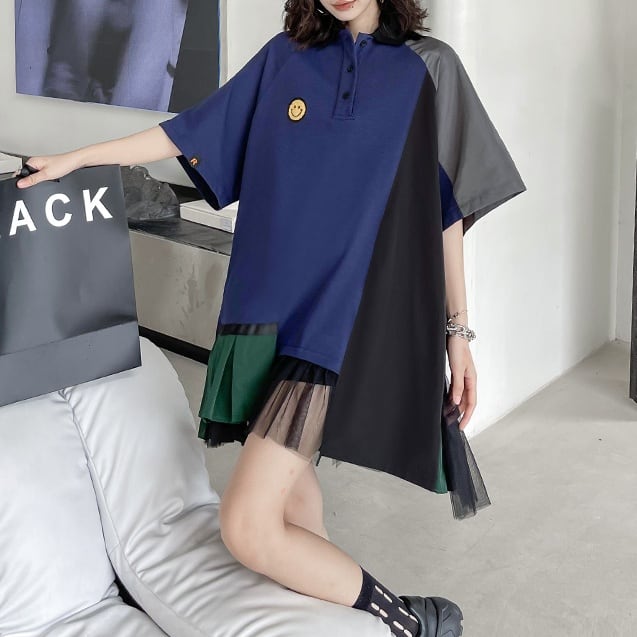 ダークな寒色系のスティッチデザインにスマイルの刺繍パッチがアクセントになった、ミニ丈のポロシャツワンピースです。ボックスプリーツのレイヤードやメッシュのフリルがスティッチされた裾が、キュートなシルエットを作っています。