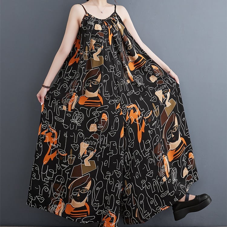 抽象的な顔のイラスト柄がキュートな、ワイドレッグ・ショルダーストラップのジャンプスーツです。ロング丈のキャミソールワンピースのような、Aラインのシルエットが魅力的なアイテムです。