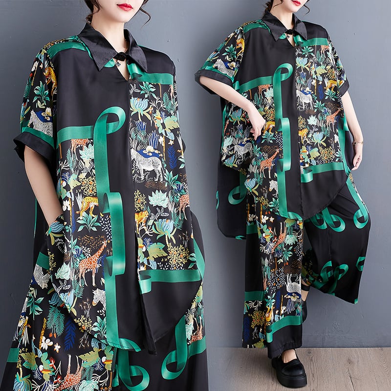 ブラック地にグリーンのリボンやネイチャープリントが目を惹く、ポロ襟・半袖・ロングライン・ハイローヘムのデザインシャツと、ワイドレッグパンツのセットアップです。スカーフのようなヨーロピアンプリントが優雅で、ゆったりとしたシルエットがエレガントな雰囲気のアイテムです。