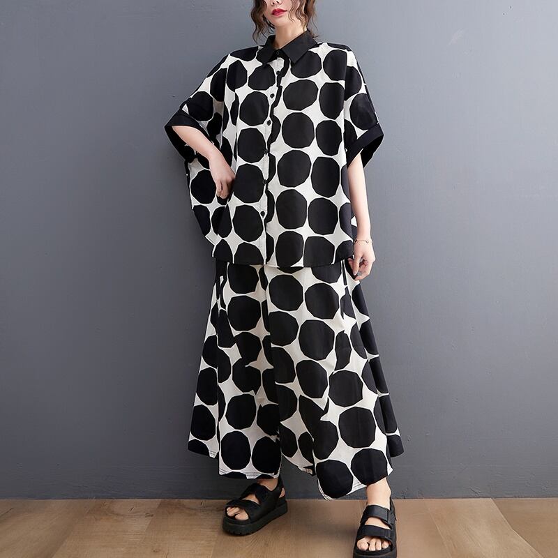 DOT PRINT HALF SLEEVES SHIRT & WIDE LEG SAROUEL PANTS SET 2pieces 1color M-7375