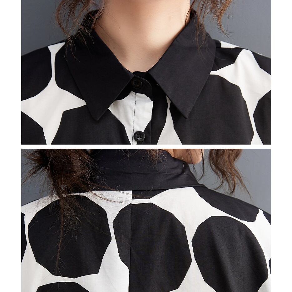モノトーンの大きなドット柄がキュートな、ポロ襟・半袖・ラウンドカットのデザインシャツと、サルエルパンツのセットアップです。上下共にワイド幅のゆったりとしたシルエットで、モードな印象のアイテムに仕上がっています。