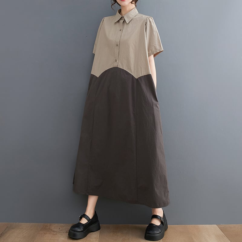 CONTRAST DESIGN HALF SLEEVES A-LINE LONG SHIRT DRESS 2colors M-7396