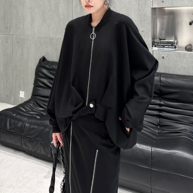 BLACK BASEBALL COLLAR IRREGULAR HEM FULLZIP JACKET 1color M-7737