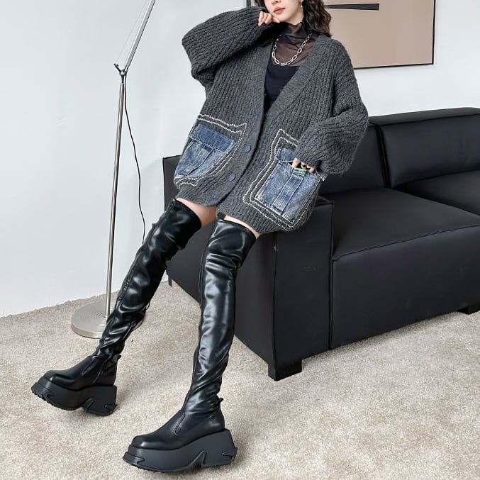 ブルーデニムのスティッチポケットがキュートな、グレーのVネック・ニットカーディガンです。ゆったりとしたシルエットのチュニック丈で、何にでも合わせやすいカジュアルなアイテムです。