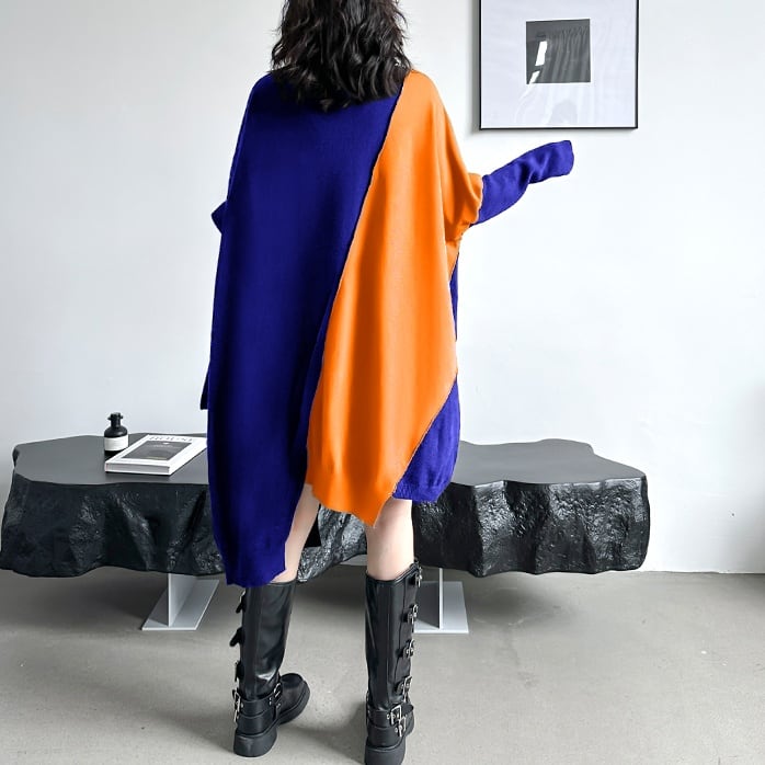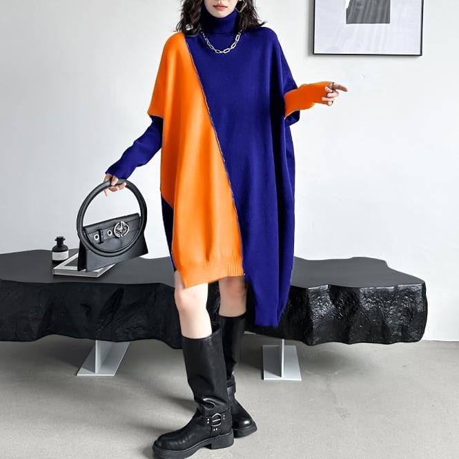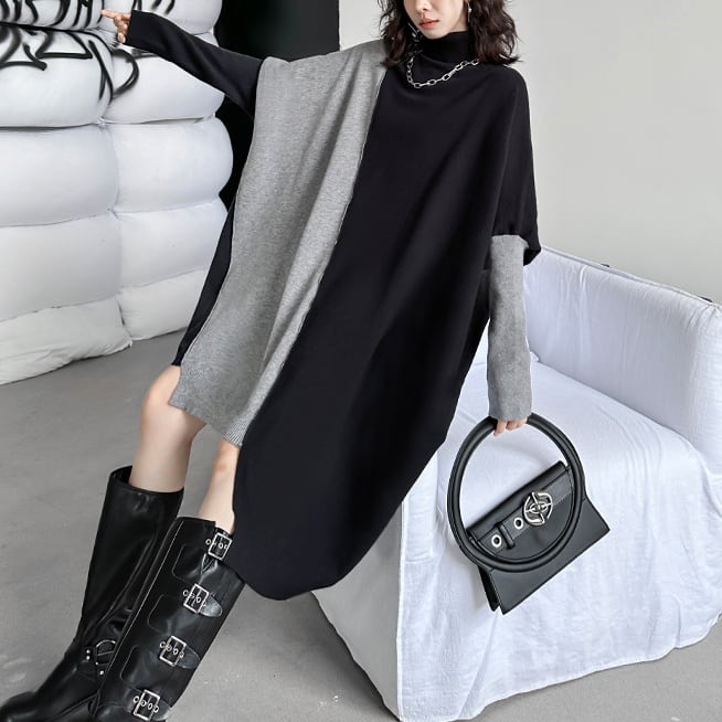 コントラストスティッチデザインとアシンメトリックな裾のラインが特徴的な、タートルネック・長袖・ミドル丈のニットワンピースです。ワイド幅のバットスリーブで、シルエットが魅力のアイテムです。色は黒×グレーとオレンジ×ブルーの2色から選べます。
