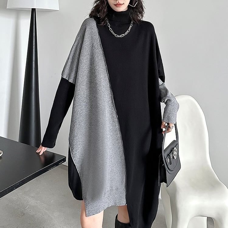 ASYMMETRIC CONTRAST DESIGN TURTLE NECK MIDI KNIT DRESS 2colors M-7858