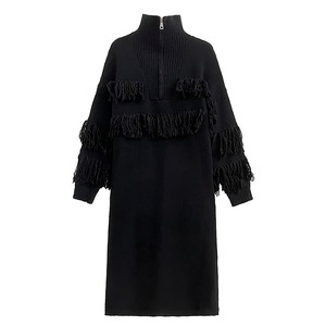 FRINGE TRIMMED HIGH NECK HALF ZIP BLACK MIDI KNIT DRESS 1color M-7864