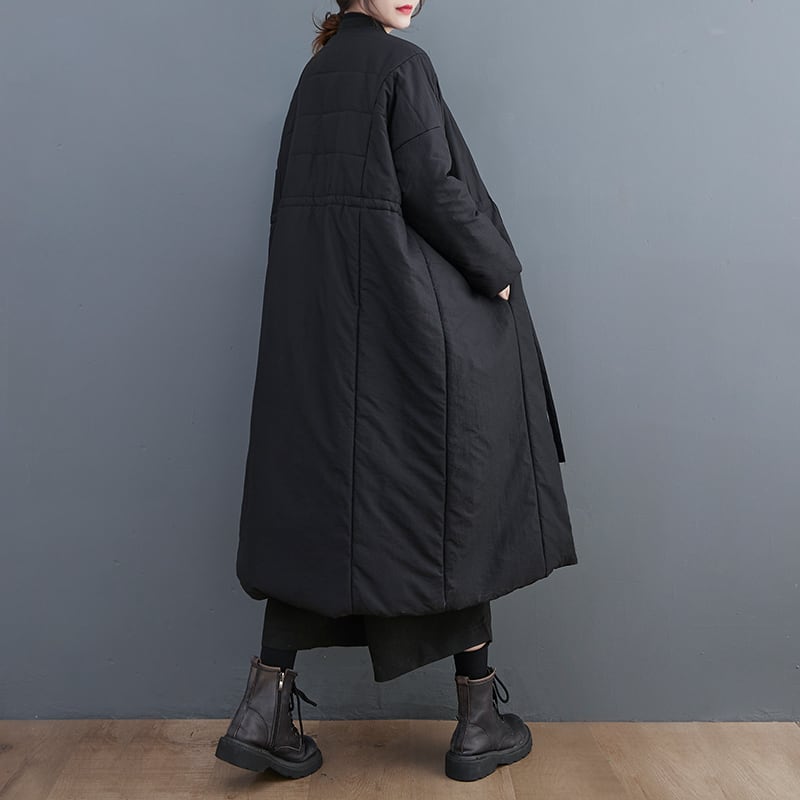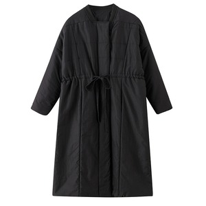 シンプルで小物アレンジの利く、ブラックの長袖・Aライン・ミドル丈の中綿コートです。襟なし・比翼付き・ウエストの高い位置でのドローストリングなど、シルエットにこだわりを感じるアイテムです。