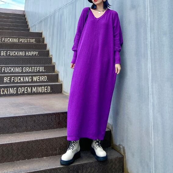 ゆったりとしたワイド幅のシルエットがリラックスした雰囲気の、Vネック・長袖・ロング丈のニットワンピースです。単色で他のアイテムと合わせやすい、アレンジの利くアイテムです。色はパープルとブラックの2色から選べます。