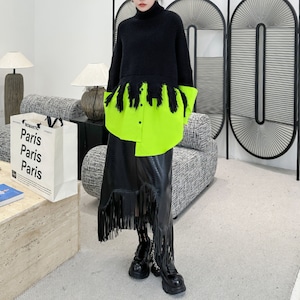 眼を引くネオンカラーとフリンジが融合したこのタートルニットは、モダンな都会のリズムに合わせた大胆なスタイリングを提案します。柔らかなウール素材とユニークなデザインが、冬の装いに新鮮なアクセントを加えてくれます。