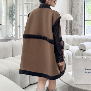 ラムウールのような暖かなフリース素材と柔らかなフェイクレザーのリバーシブルが嬉しい、スタンドカラー・ノースリーブ・チュニック丈のベストジャケットです。落ち着いた色味で、何にでも合わせやすいカジュアルなアイテムです。