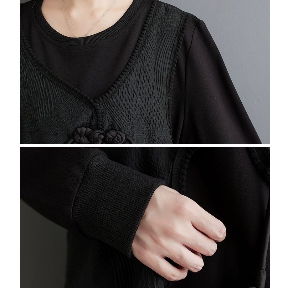 BLACK FAKE-2-PIECE ROUND NECK PULLOVER & DESIGN LONG SKIRT SET 2pieces 1color M-8563