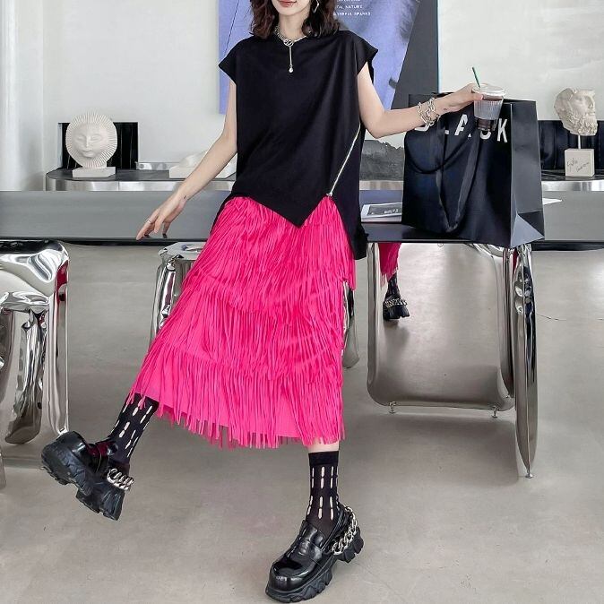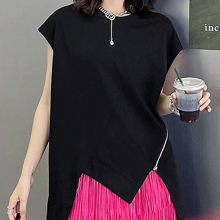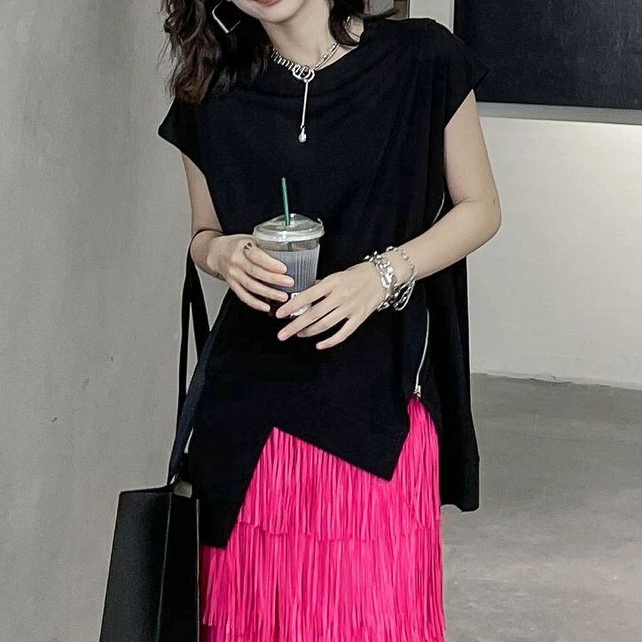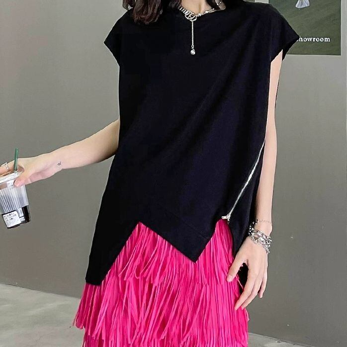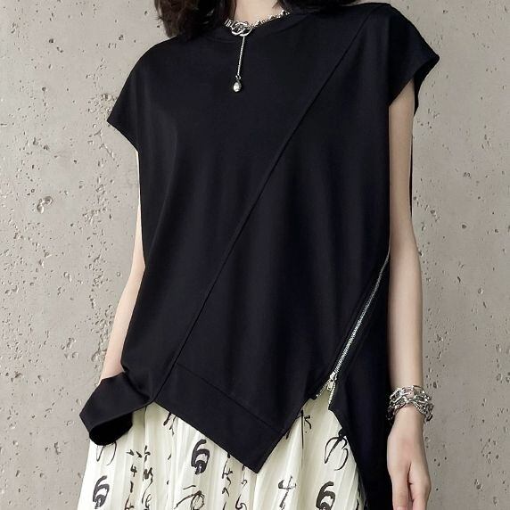 斜めの切り返しやジップ飾りに合わせたジグザグの裾のラインが特徴的な、ラウンドネック・フレンチスリーブのデザイントップです。ブラックの単色で何にでも合わせやすい、クールな印象のアイテムです。