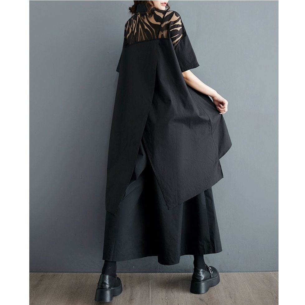 BLACK LACE STITCH HIGH-LOW HEM A-LINE HALF SLEEVES SHIRT 1color M-9375