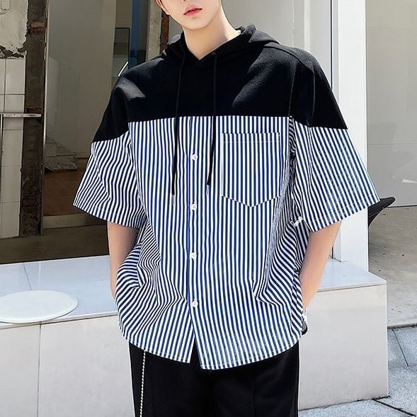 ストライプと無地の素材をミックスしたシャツ。非対称のカットがユニークなデザインです。