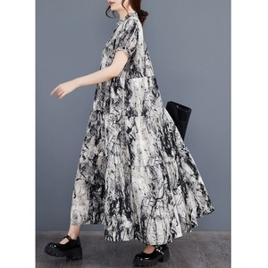 MONOTONE PRINT STAND COLLAR HALF SLEEVES A-LINE LONG SHIRT DRESS 1color M-9903