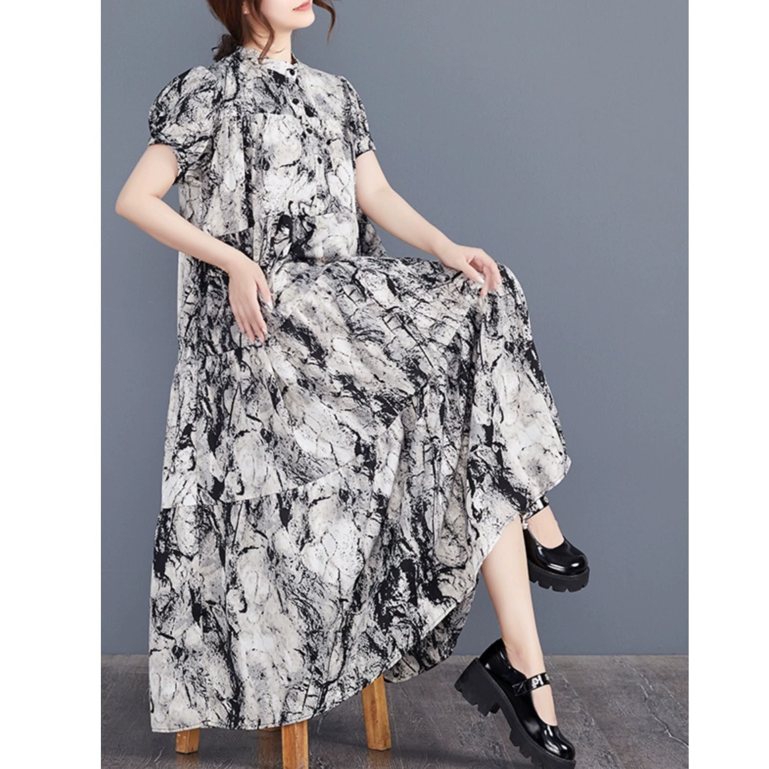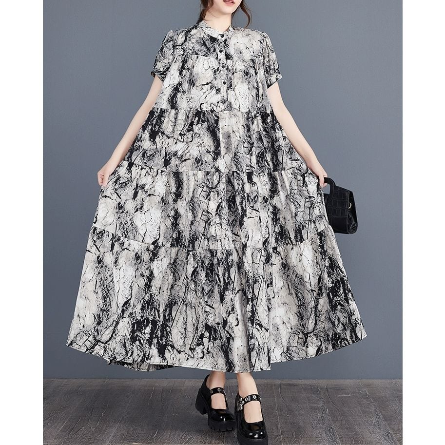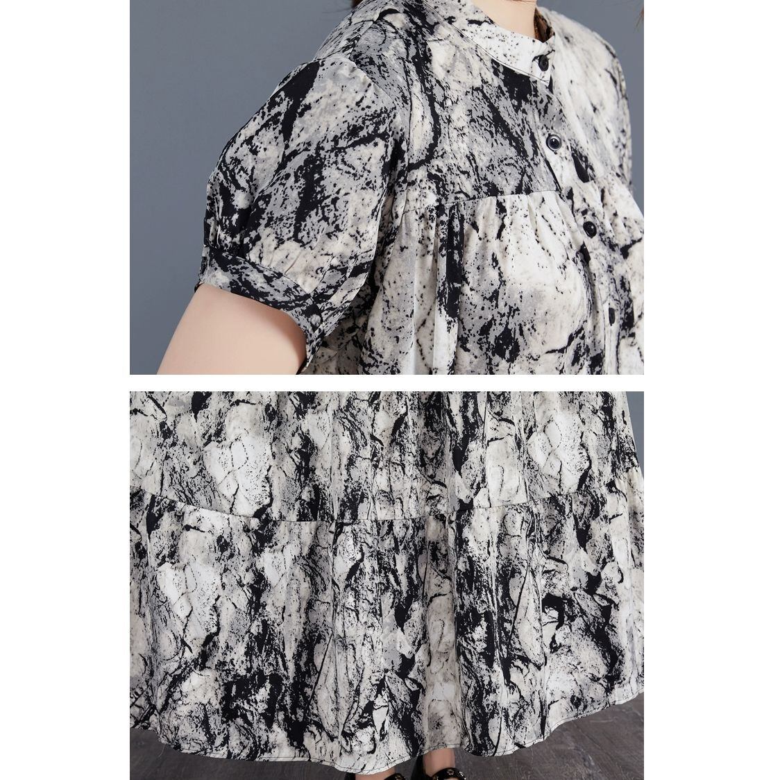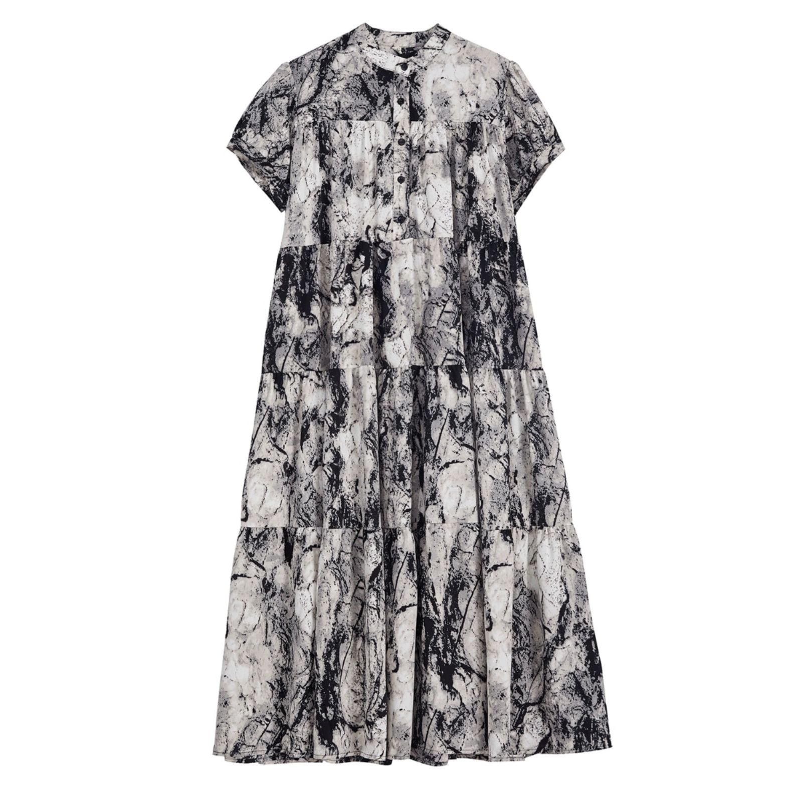 モノトーンのアーティスティックな柄生地がクールな、スタンドカラー・ハーフボタン・半袖・ロング丈のシャツワンピースです。ティアードデザインの大きく広がるAラインのシルエットが魅力的な、エレガントな雰囲気のアイテムです。