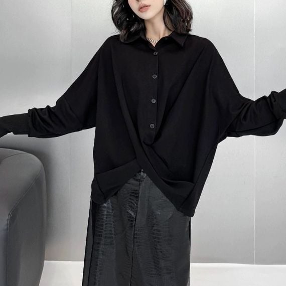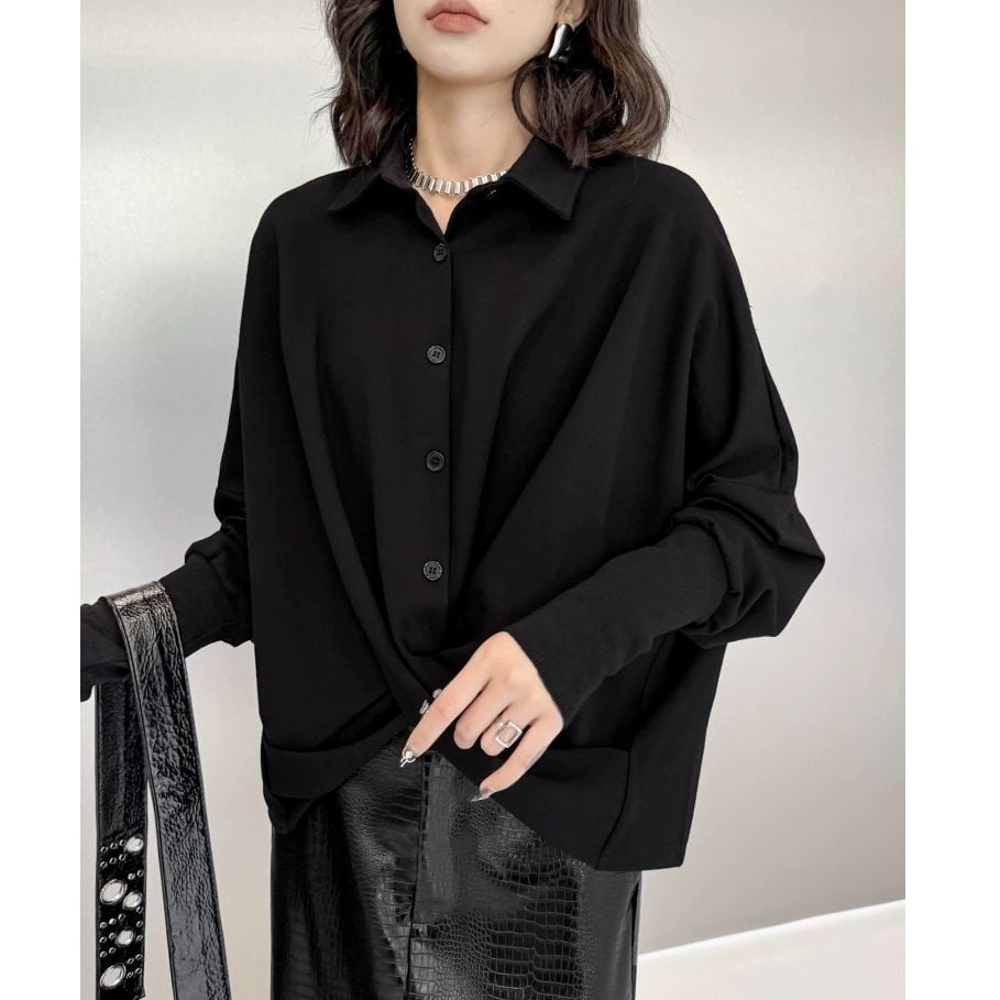 BLACK CROSSED HEM BAT SLEEVES PULLOVER SHIRT 1color M-10174