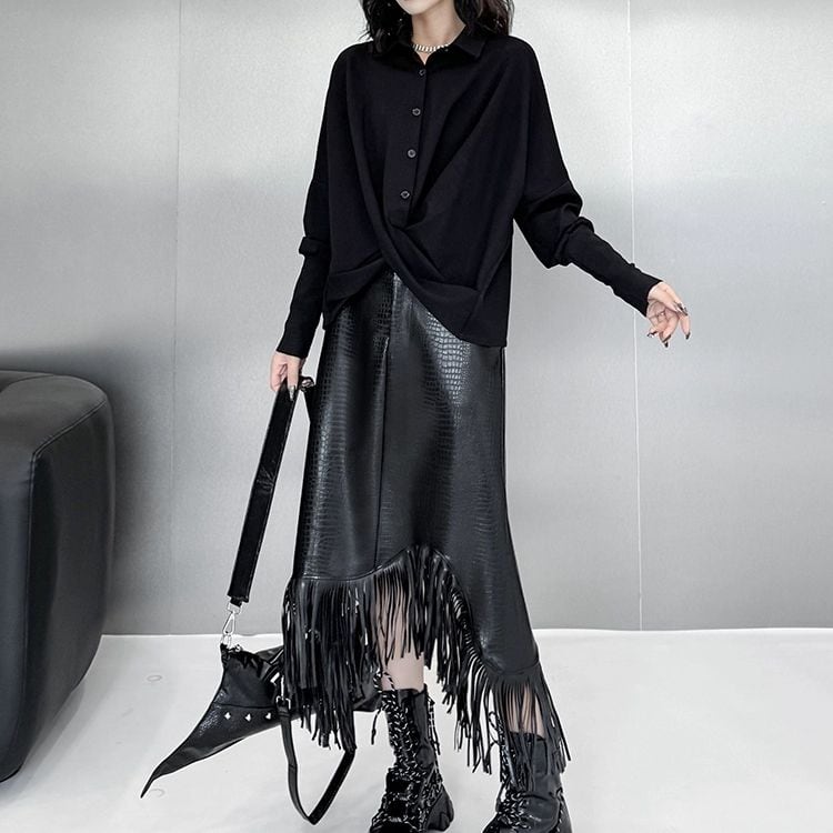 シックなブラックがクールな印象の、ポロ襟・長袖・イレギュラーヘムのプルオーバー・デザインシャツです。バットスリーブにリブの長い袖口、クロスデザインの裾など、シルエットが印象的なアイテムです。