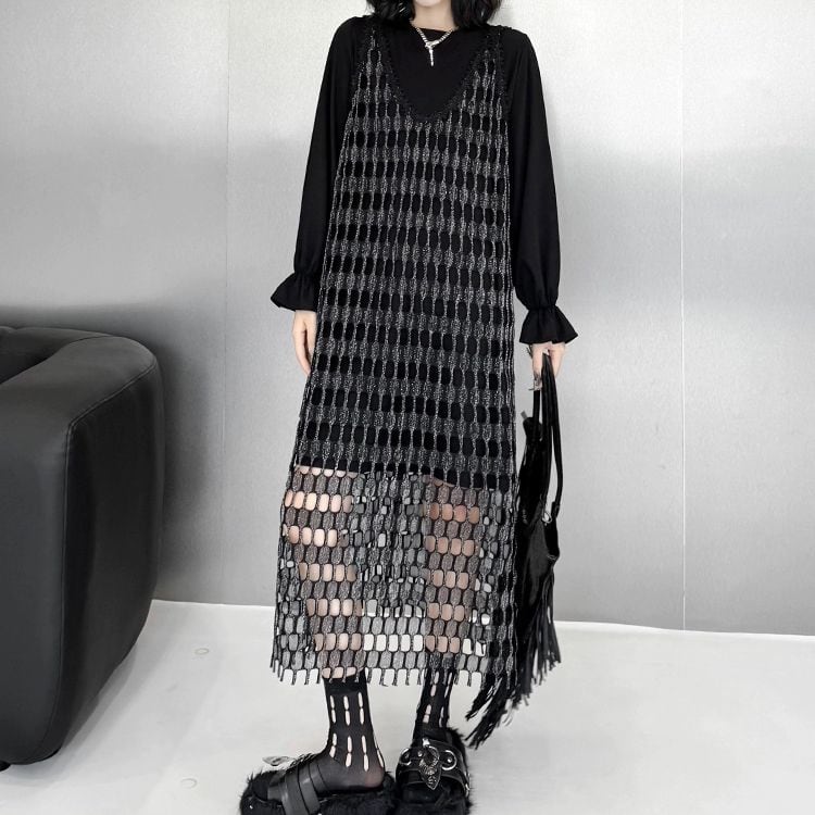 ブラックのラウンドネック・長袖・ミニ丈のプルオーバーワンピースと、シルバーのラメがクールなメッシュ素材でできたノースリーブ・Vネック・ロング丈のワンピースのセットです。袖口がフリル状になったキャンディスリーブやフリンジのような裾、異なる丈で作り出した透け感がこだわりを感じるデザインです。