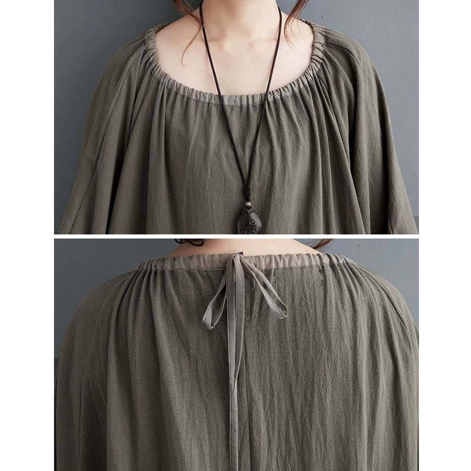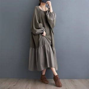 CONTRAST STITCH BOAT NECK LANTERN SLEEVES LONG DRESS 1color M-10298