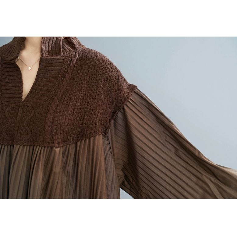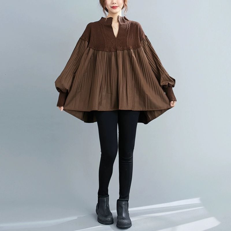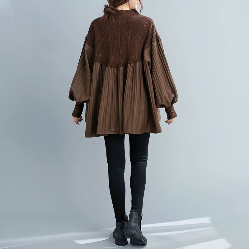 ネックからショルダーの部分がニット素材でできた、スタンドカラー・スリットネック・長袖・チュニック丈のプルオーバーデザインシャツです。ランタンのような大きく膨らんだ袖やAラインのプリーツシャツなど、シルエットが魅力的なアイテムです。ブラックとブラウンの2色から選べます。