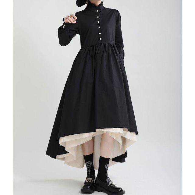胸の高さを横断する2色のラインが印象的な、スタンドカラー・長袖・膝下丈のシャツワンピースです。ゴム加工された袖口や、ふんわり広がるAラインのシルエットが魅力的なアイテムです。色はブラックとカーキの2色から選べます。