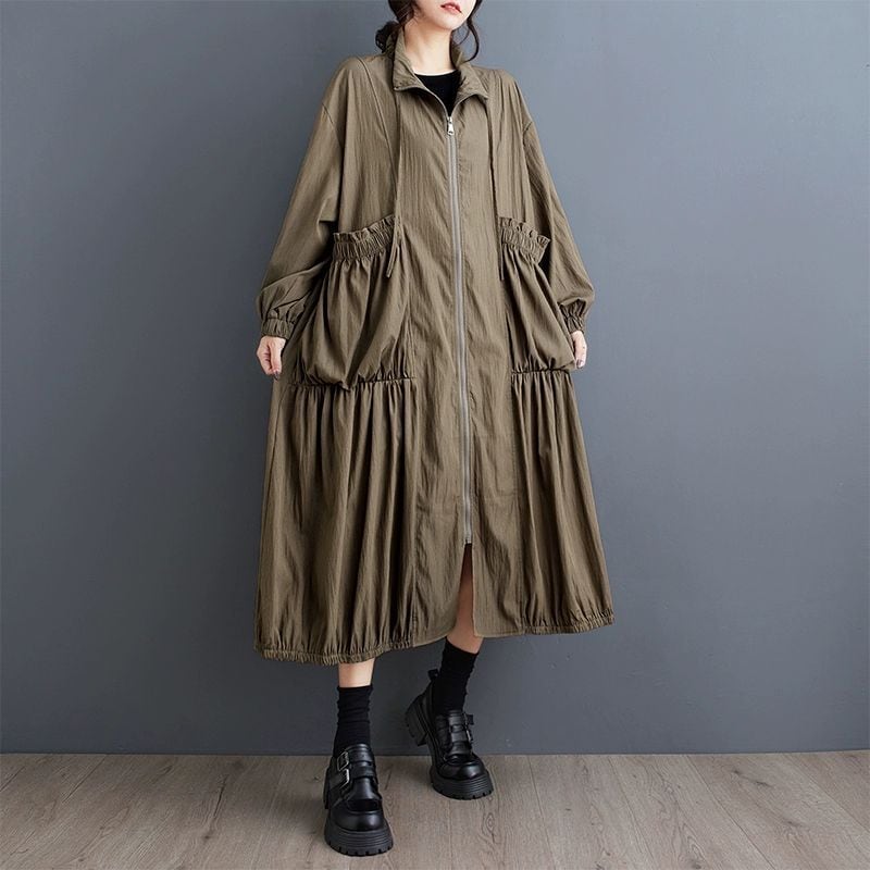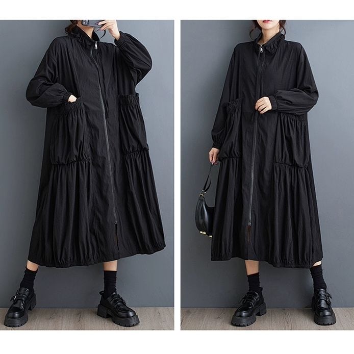 シャーリング加工された大きなポケットがキュートな、スタンドカラー・長袖・ミドル丈のフルジップ・ウインドブレーカーコートです。ゴム加工された袖口やフロントサイドの裾がお洒落な、フロントとバックで印象の異なるデザインのアイテムです。色はブラックとカーキの2色から選べます。
