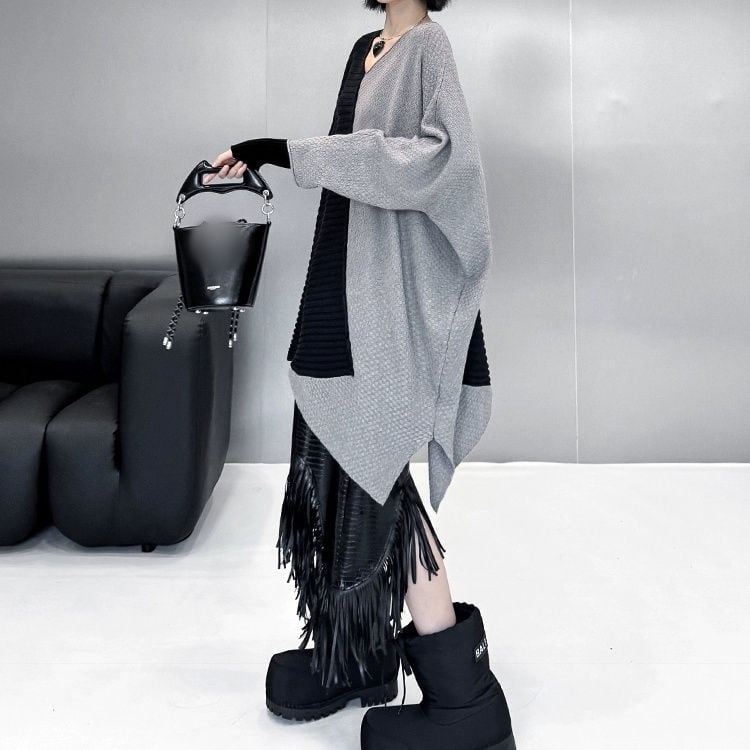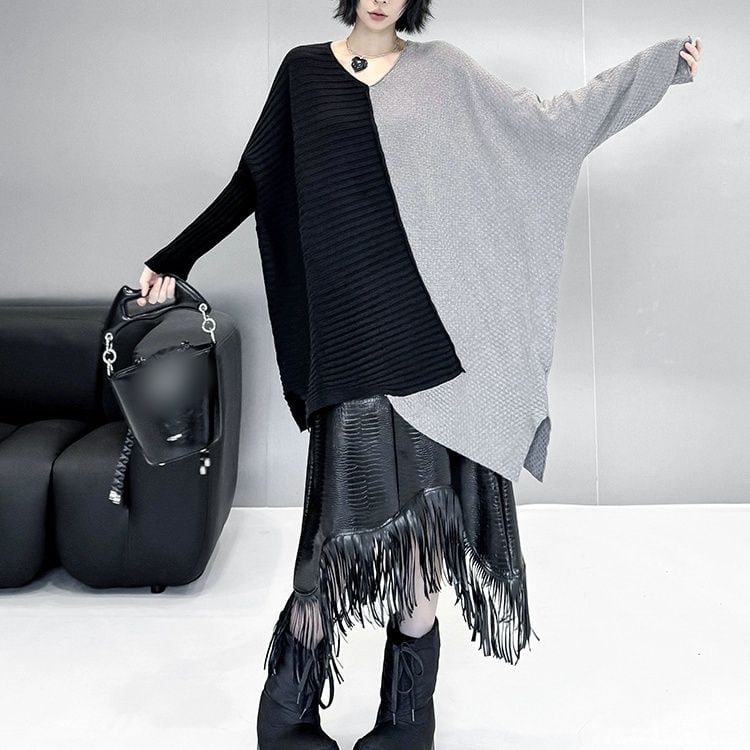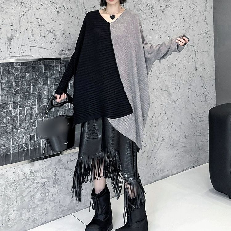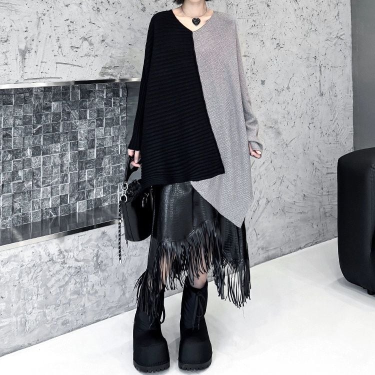 アシンメトリックなコントラストデザインが目を惹く、Vネック・長袖・チュニック丈のプルオーバーニットです。シルエットが魅力的な、コーディネートの主役になるアイテムです。ブルー×オレンジ・ブラック×グレー・ブラック×レッドの3色から選べます。