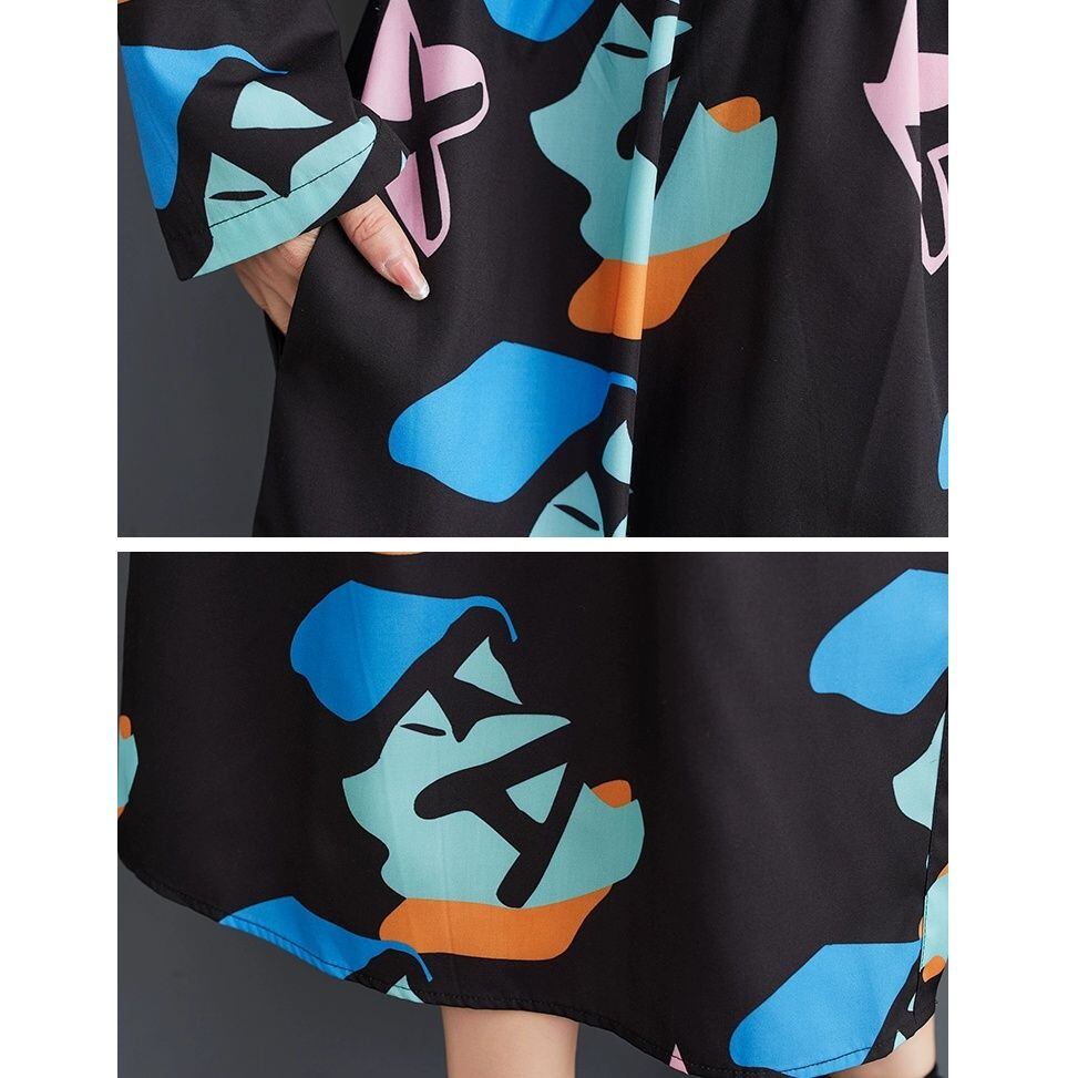 レトロでカラフルな柄生地にブラックのスティッチデザインが目を惹く、ポロ襟・長袖・ミドル丈のシャツワンピースです。ふんわりとしたAラインのシルエットがキュートな、1枚でオシャレが完成するアイテムです。