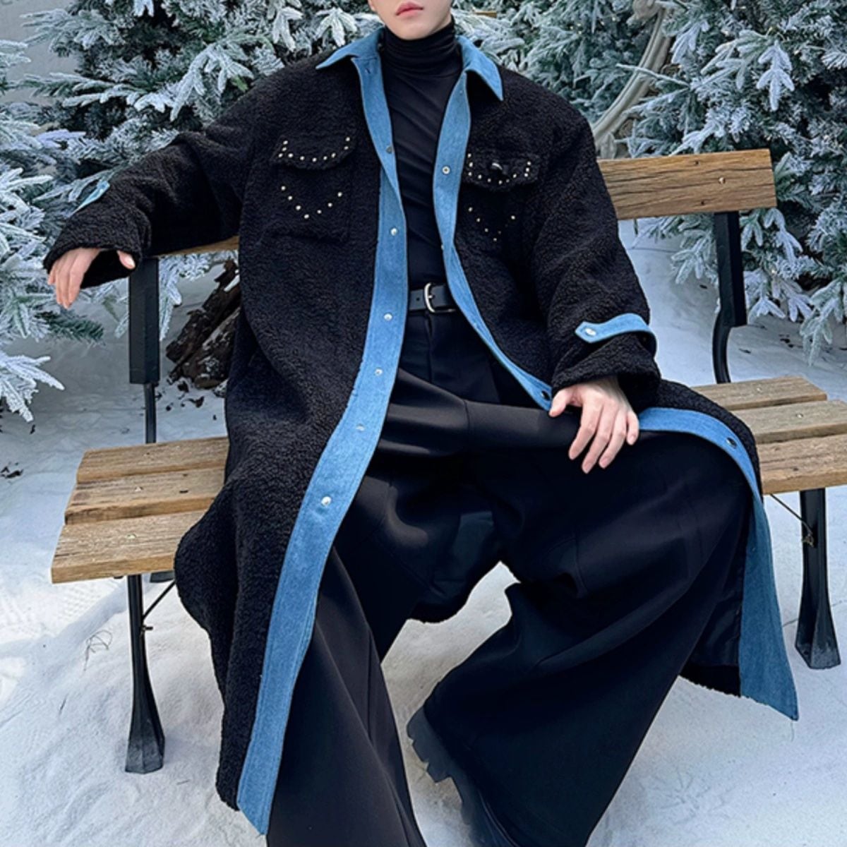 【Men】PATCHWORK LONG DENIM COAT WITH SHEARLING LINING FOR WARMTH AND STYLE S-1921
