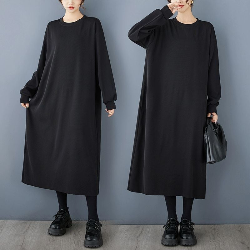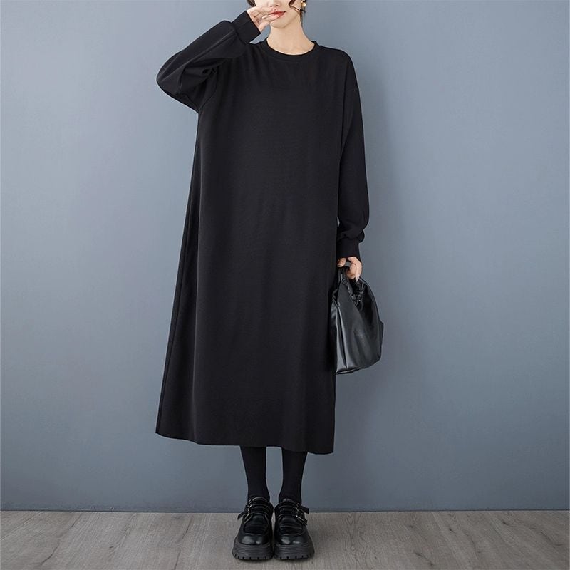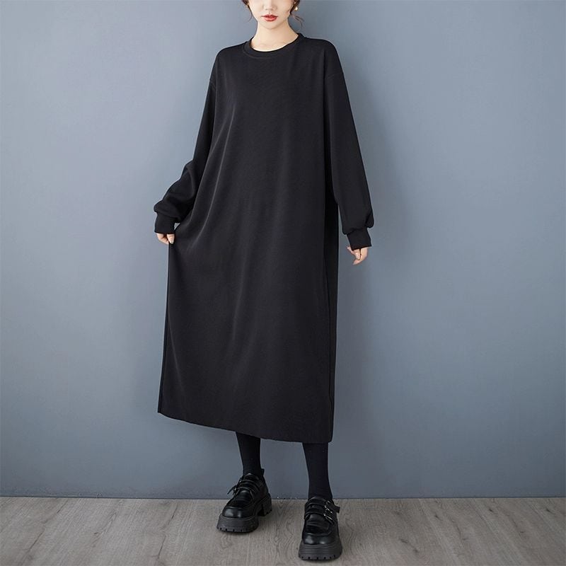 シックなブラックのシンプルなデザインがクールな、ラウンドネック・長袖・膝下丈のプルオーバーワンピースです。ドロップショルダーのゆったりとしたシルエットで、リラックスして過ごせるカジュアルアイテムです。
