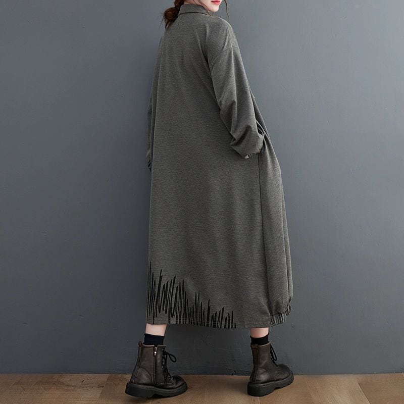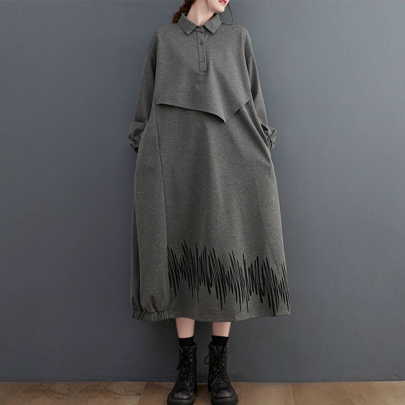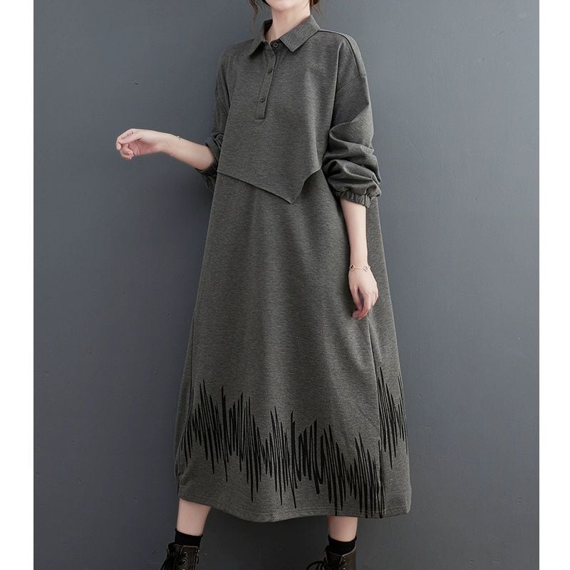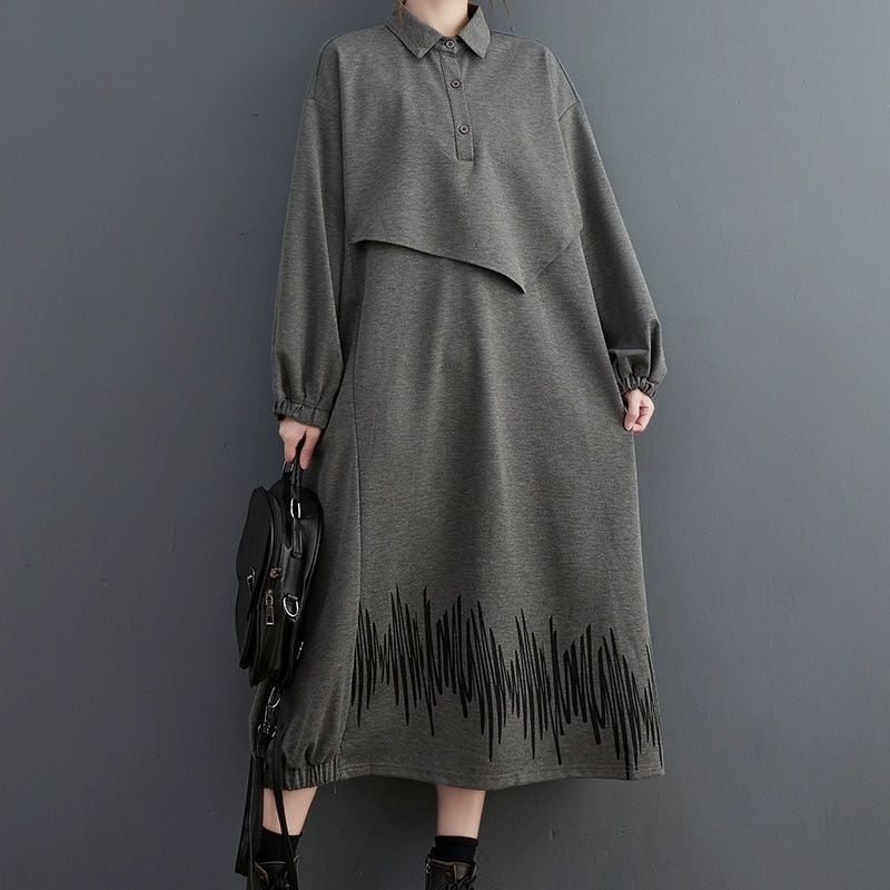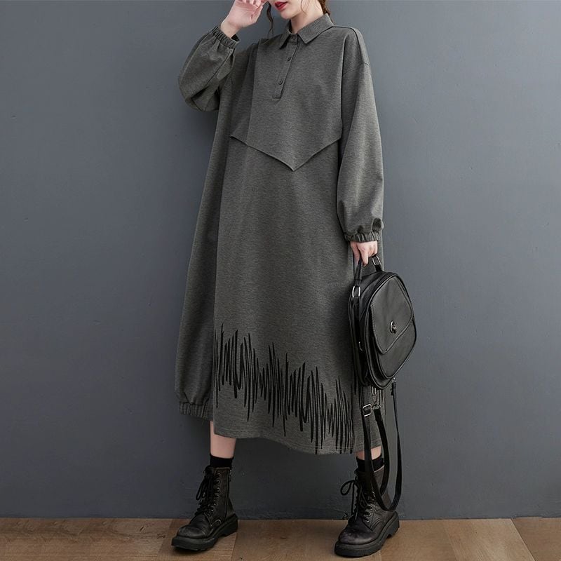 ダークグレーのスウェット素材でできた、ポロ襟・ハーフボタン・長袖・膝下丈のシャツワンピースです。袖口と右サイドの裾がゴム加工された、アシンメトリックなデザインとジグザグラインのプリントが印象的なアイテムです。