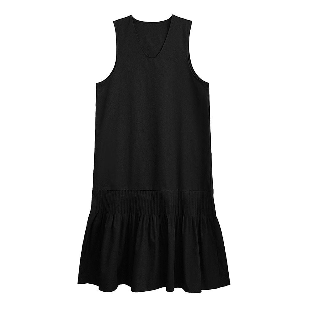ブラックのUネック・ノースリーブ・膝下丈のジャンパースカートと、ホワイトのデザインシャツです。別売りです。スカートは、プリーツで作られたフリルのような裾のシルエットがキュートなアイテムです。シャツは、プリーツやシャーリング飾りが付いた、ガーリーなアイテムです。